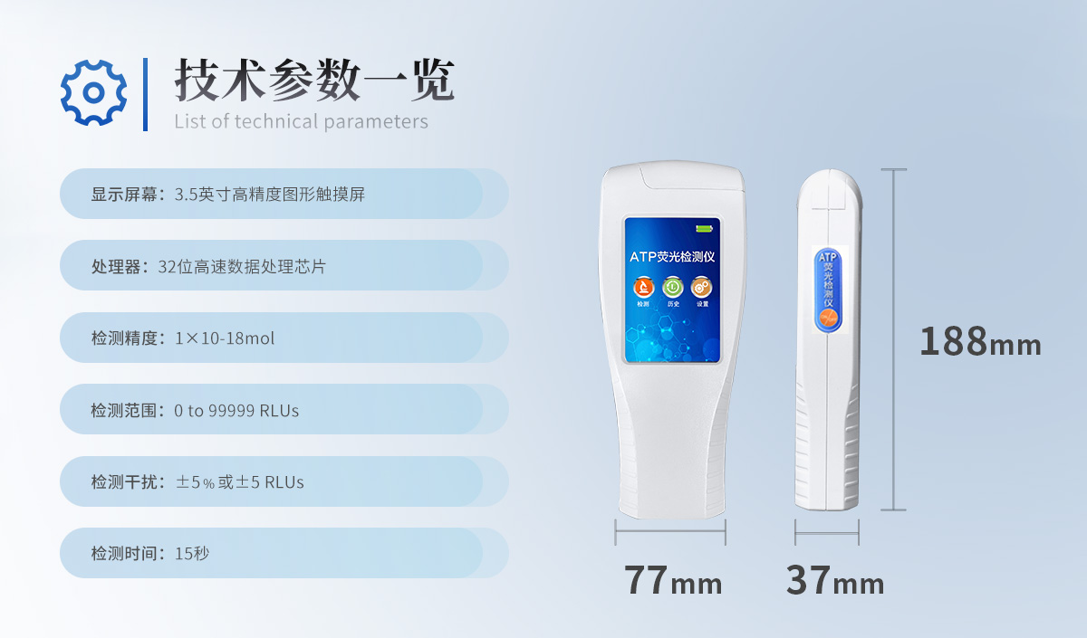該設備為全新升級產品,大屏幕觸摸顯示屏,代替?zhèn)鹘y(tǒng)按鍵。操作采用生物化學反應方法檢測ATP含量,ATP熒光檢測儀基于螢火蟲發(fā)光原理,利用“熒光素酶—熒光素體系”快速檢測三磷酸腺苷(ATP)。ATP拭子含有可以裂解細胞膜的試劑,能將細胞內ATP釋放出來,與試劑中含有的特異性酶發(fā)生反應,產生光,再用熒光照度計檢測發(fā)光值,微生物的數(shù)量與發(fā)光值成正比,由于所有生物活細胞中含有恒量的ATP,所以ATP含量可以清晰地表明樣品中微生物與其他生物殘余的多少,用于判斷衛(wèi)生狀況。