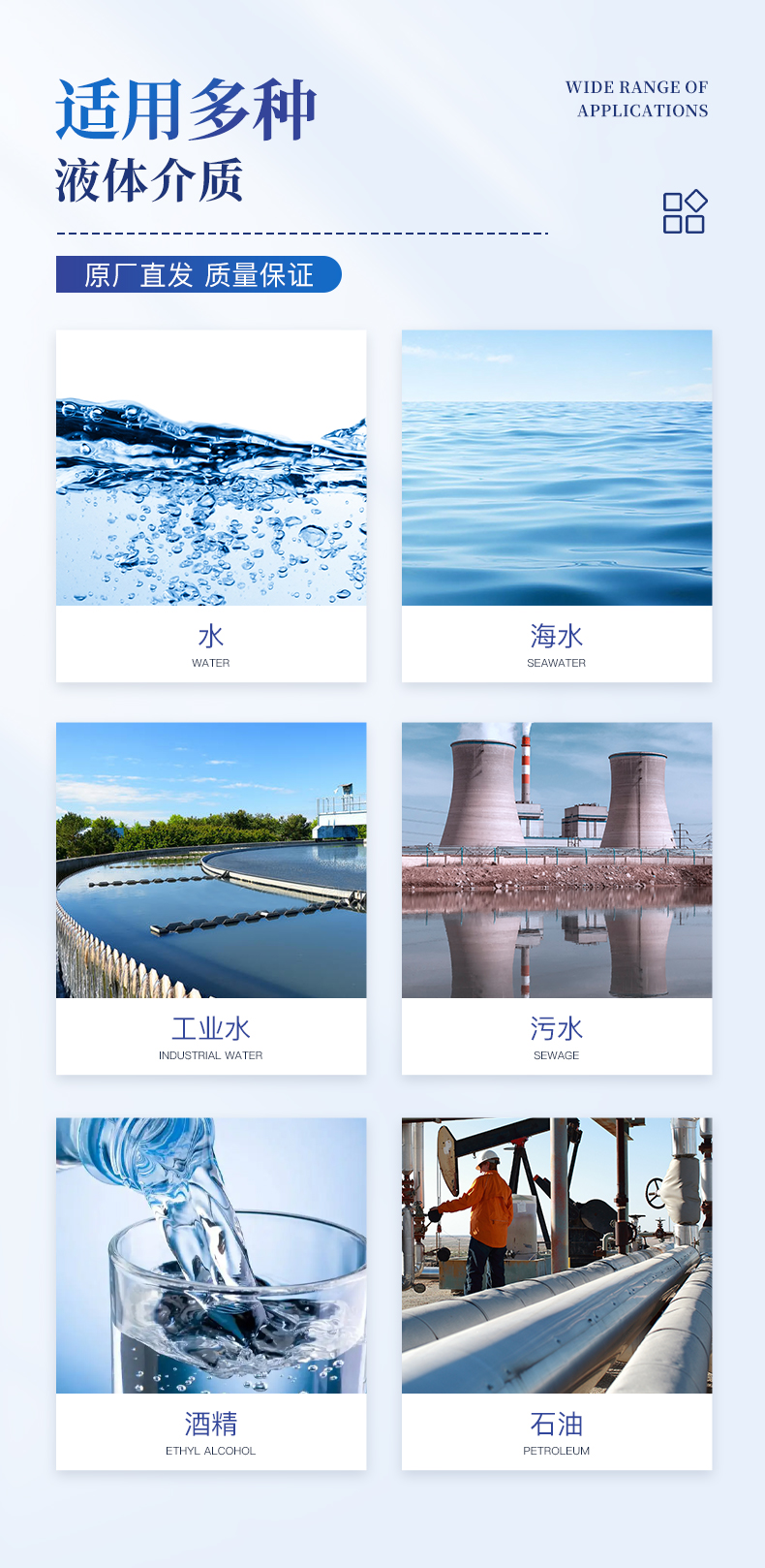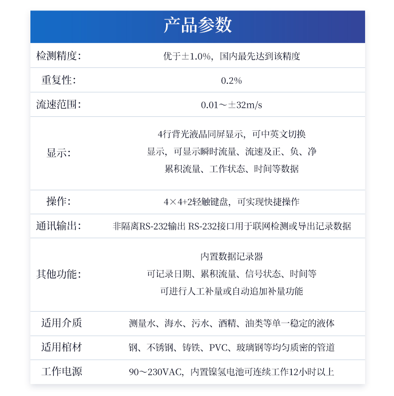 故障自診斷功能; 適用介質(zhì):測(cè)量水、海水、污水、酒精、油類等單一穩(wěn)定的液體;