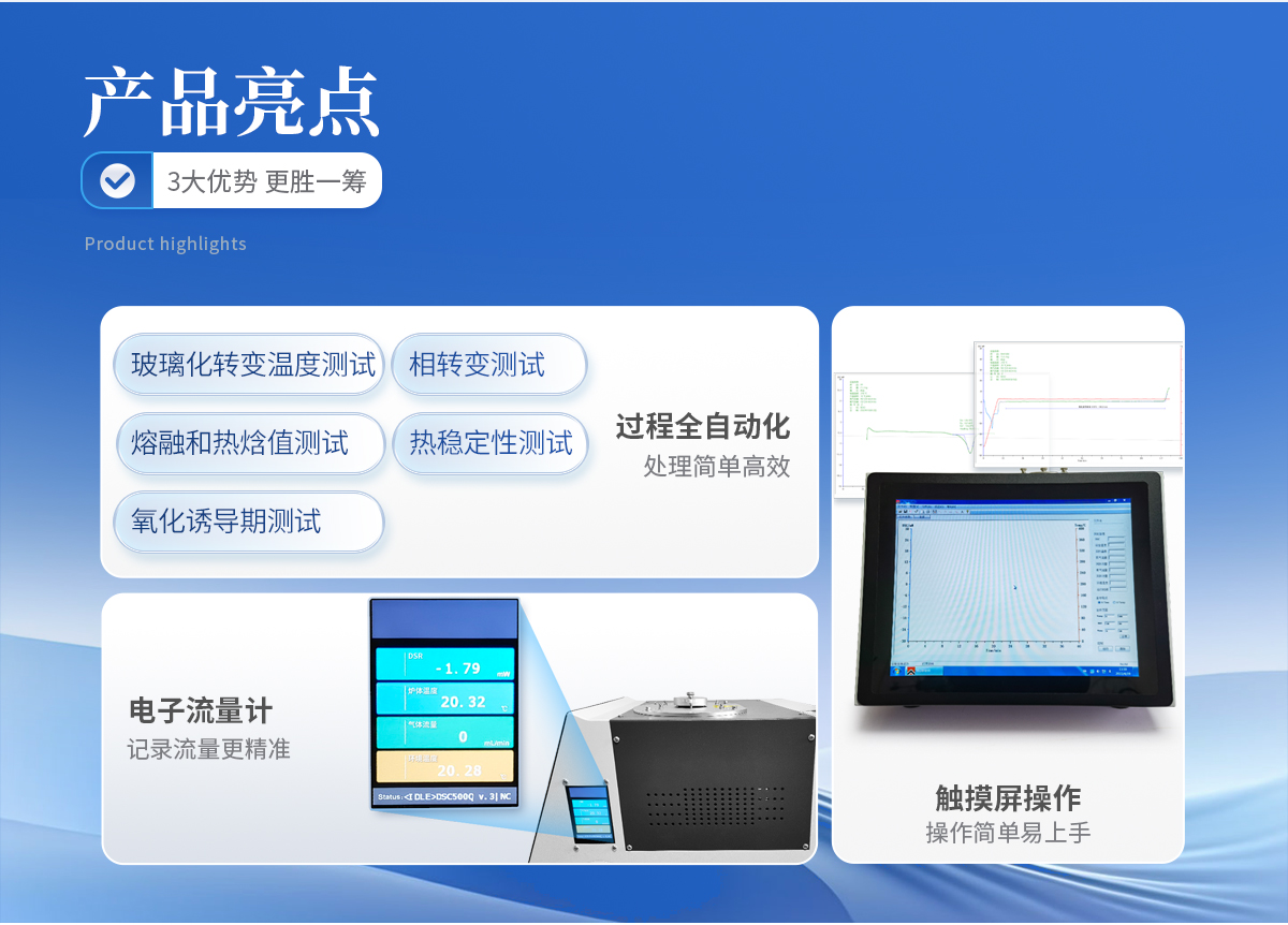 差示掃描量熱儀為觸摸屏式,可進行玻璃化轉變溫度測試、相轉變測試、熔融和熱焓值測試、產品穩定性、氧化誘導期測試。