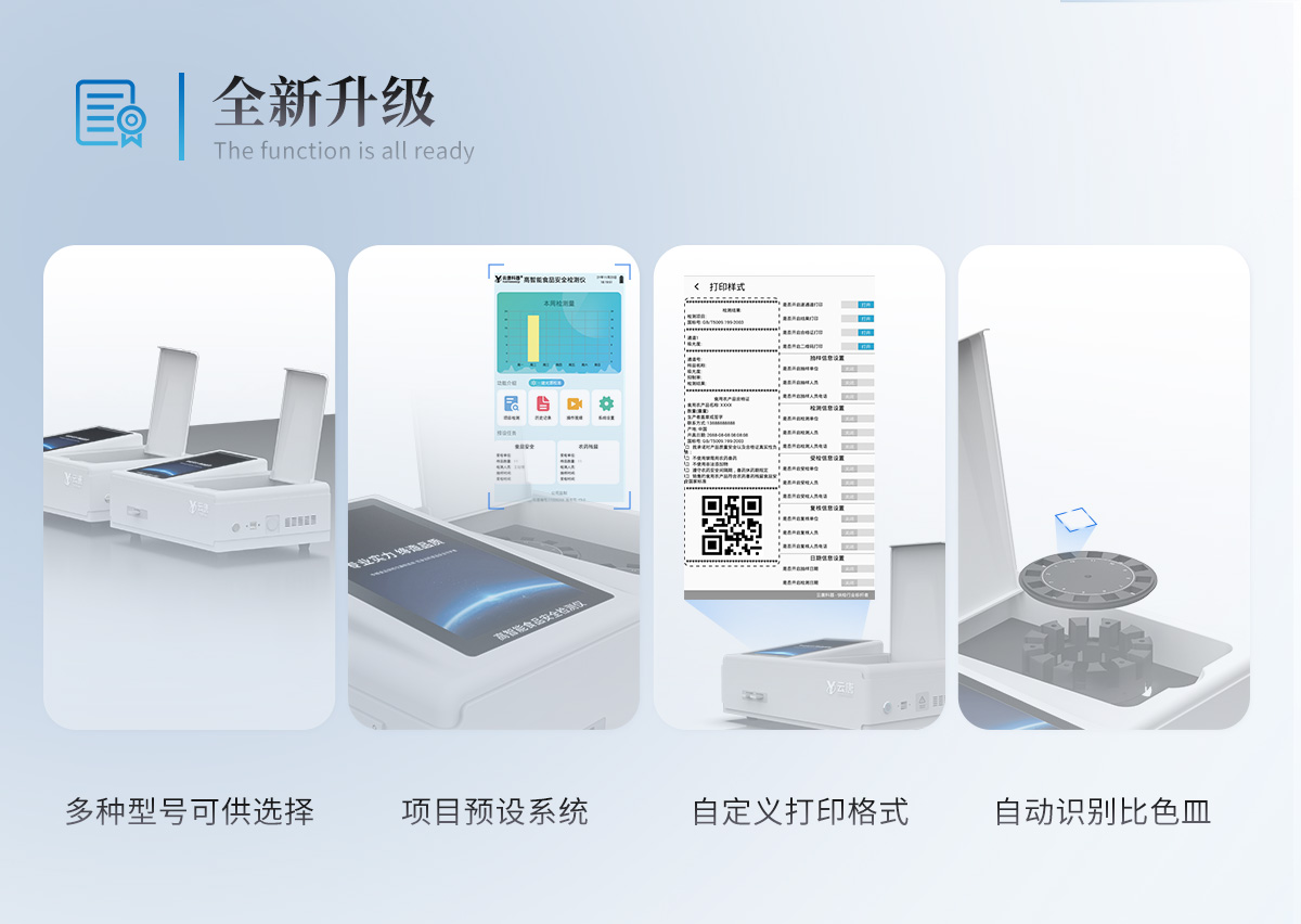 | 儀器采用手提式一體化系統(tǒng)檢測技術(shù),將分光光度模塊、數(shù)字化管理模塊、無線通訊模塊高度集成于一體,支持檢測200種食品安全檢測項目,同時預(yù)留升級檢測方法。 | 儀器檢測模塊標(biāo)準(zhǔn)化、智能化,檢測項目可隨意自由組合。檢測箱體內(nèi)置多個標(biāo)準(zhǔn)檢測單元,檢測模塊可以調(diào)整配置。 | 顯示屏幕:儀器采用10.1英寸豎向液晶觸摸屏顯,搭配運行安卓智能操作系統(tǒng),主控芯片采用ARM Cortex-A7,RK3288/4核處理器,主頻1.88Ghz,操作方便,性能更強。 | 檢測通道:≥12通道;采用精密旋轉(zhuǎn)比色池設(shè)計,使用同芯片同光源校準(zhǔn)精度,解決不同光源之間的誤差值,更加準(zhǔn)確**。(1-12通道間誤差0.1%,**號:**202022821055.2) | 儀器光源:高精度進口四波長冷光源,每個通道均配置 410、520、590、630nm 波長光源,標(biāo)配**的光路切換裝置,**光路切換功能可實現(xiàn)64波長,并且所有檢測項目可實現(xiàn)所有通道同時檢測。 | 設(shè)備可一鍵校準(zhǔn),自動保存校準(zhǔn)數(shù)據(jù),自動對比校驗,得到精準(zhǔn)光源,采用Android SP存儲數(shù)據(jù),光源數(shù)據(jù)永不丟失,方便每一次使用。 | 通訊接口:配備無線通信模塊、4G(APN)通訊模塊、藍牙傳輸,同時具有雙USB接口以及RJ45網(wǎng)線接口,可以多方式實現(xiàn)數(shù)據(jù)保存及數(shù)據(jù)傳輸。 | 存儲方式:支持U盤存儲,標(biāo)準(zhǔn)USB接口,免驅(qū)動安裝。檢測結(jié)果存儲容量20萬條以上,可生成Excel表格進行拷貝,并具有登錄保護功能。 | 智能化操作系統(tǒng): | 1)操作系統(tǒng):儀器可在同一檢測界面自動對應(yīng)相關(guān)檢測通道,一次性選擇1-12個樣品名稱,無需退出界面,節(jié)省操作時間。并可以對每個通道屬性和樣品信息單獨進行編輯,例如送檢單位、人員,檢測人員等,打印時勾選打印顯示。 | 2)數(shù)據(jù)集成系統(tǒng):設(shè)備首頁自動匯總分析檢測數(shù)據(jù),包含:周檢測數(shù)據(jù)、月檢測數(shù)據(jù),全部檢測總數(shù)量,均包含檢測總數(shù),合格數(shù),不合格數(shù),以及相關(guān)柱形分析圖,各項檢測數(shù)據(jù)一目了然,無需電腦查詢,更加快捷直觀。 | 3)數(shù)據(jù)庫系統(tǒng):十幾項數(shù)據(jù)庫分類管理儀器:包含項目類型、項目數(shù)據(jù)、檢測數(shù)據(jù)、歷史記錄、國標(biāo)信息、曲線信息、采樣信息、檢測信息、受檢信息、復(fù)核信息、圖表信息、光源校準(zhǔn)信息、打印樣式信息、樣品庫信息等等,數(shù)據(jù)庫之間互相協(xié)調(diào)聯(lián)動保證數(shù)據(jù)的真實完整性。同時產(chǎn)品數(shù)據(jù)庫以及歷史檢測記錄支持一鍵檢索功能。 | 4)限量規(guī)判系統(tǒng):具有限量查詢、添加物質(zhì)合規(guī)判定系統(tǒng)。檢測出結(jié)果后,系統(tǒng)自動調(diào)用系統(tǒng)數(shù)據(jù)庫中相關(guān)國標(biāo)進行比對判定,客觀顯示判定結(jié)果是否合格。 | 5)項目預(yù)設(shè)系統(tǒng):儀器具有任務(wù)預(yù)設(shè)模塊,一鍵提前預(yù)設(shè),給出方便快捷的新檢測方案,每一個任務(wù)分別可以設(shè)置不同的樣品、批次、編號、來源、備注、抽樣信息、檢測信息、受檢信息、復(fù)核信息等更多信息。樣品送檢時一鍵調(diào)取保存信息,并可多次調(diào)取,大大提高檢測效率。 | 6)數(shù)據(jù)監(jiān)管系統(tǒng):同步對接監(jiān)管平臺,數(shù)據(jù)可局域網(wǎng)和互聯(lián)網(wǎng)數(shù)據(jù)上傳,檢測結(jié)果可選擇直接傳至食品安全監(jiān)管平臺。進行區(qū)域食品安全監(jiān)管及大數(shù)據(jù)分析處理與數(shù)據(jù)統(tǒng)計,檢測區(qū)域食品安全長短期動態(tài),達到食品安全問題預(yù)估、預(yù)警。 | 7)打印系統(tǒng):內(nèi)置全新打印機,新創(chuàng)自定義打印方式,可按需靈活勾選控制:產(chǎn)品合格證(國家農(nóng)業(yè)部標(biāo)準(zhǔn)要求),二維碼,抽樣信息、檢測信息,受檢信息、復(fù)核信息、抽樣日期、檢測日期等信息的打印。 | 供電模式:儀器交直流兩用,直流12V供電,可連接車載電源,可配6ah大容量充電鋰電池,電量可實時顯示,方便戶外流動測試。 | 儀器加入遠程升級功能,可定向分客戶分儀器更新,開機后自動更新,客戶無需任何操作,即可升級全新項目。做到了無需退換機器即可實現(xiàn)實時遠程升級檢測儀器。 |