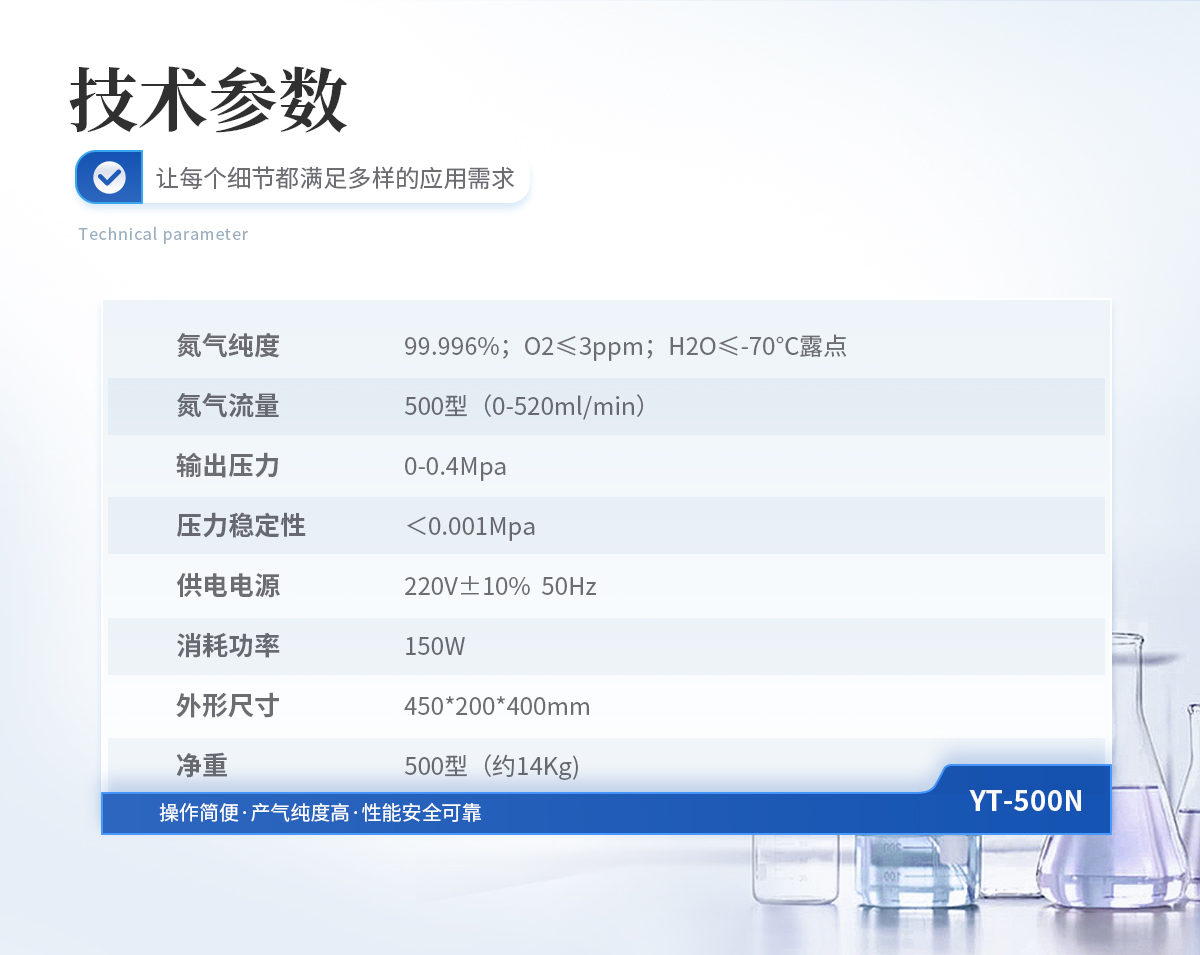 | 1、氮氣純度: 99.996%;O2≤3ppm;H2O≤-70℃露點 | 2、氮氣流量: 0-320ml/min | 3、輸出壓力: 0-0.4Mpa | 4、壓力穩定性:<0.001Mpa | 5、供電電源: 220V±10% 50Hz | 6、消耗功率: 120W | 7、外形尺寸: 450*200*400mm | 8、凈重: 300型(約14Kg) |