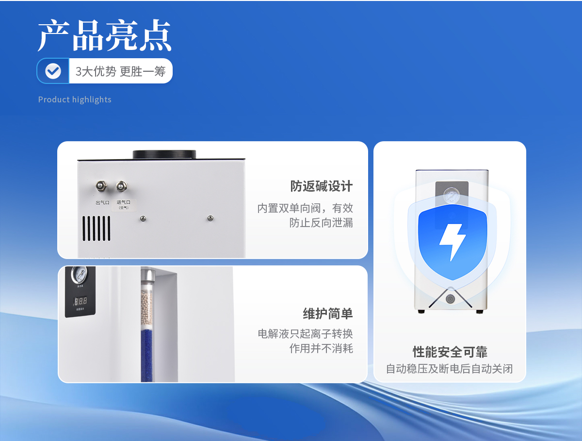 | 1、可取代高壓氮氣瓶,使實驗室儀器化。 | 2、操作簡便,只需啟動電源開關,儀器即可產氮且輸出壓力穩定。 | 3、不消耗電解液;電解液只起離子轉換作用并不消耗,所以只需補充因蒸發而損失的少量蒸餾水。 | 4、產氣純度高,空氣經電解池分離后即可得到高純氮氣。 | 5、性能安全可靠:具有穩壓和斷電后自動關閉氣路功能。 | 6、壽命長,既可間斷使用,又可連續使用且產氣量穩定、不衰減。 | 7、**節能:采用**的開關電源,提高了電解效率。 | 8、配有雙單向閥,自動防返堿。 |