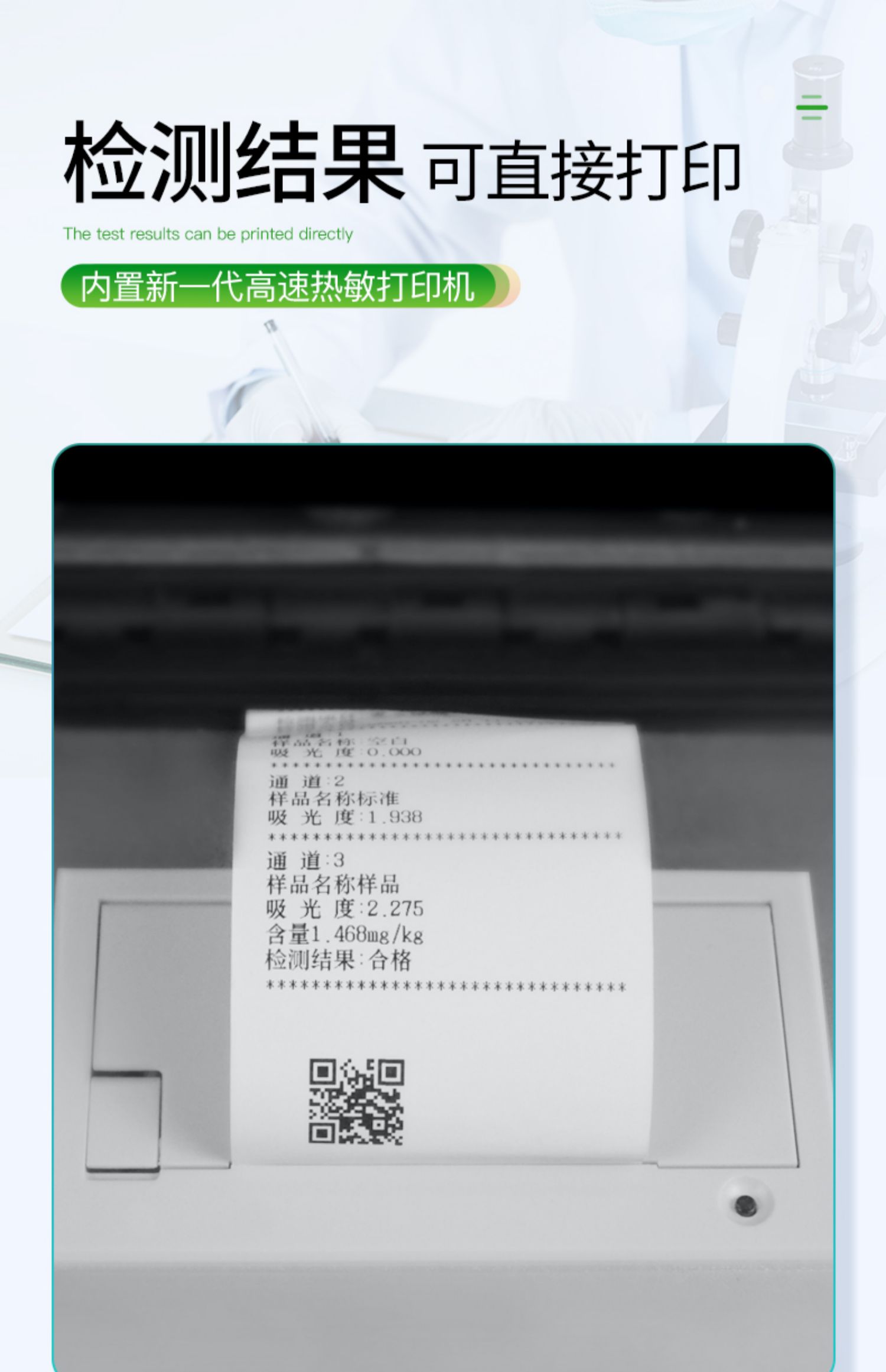 8、儀器內(nèi)置新一代高速熱敏打印機,檢測完成可自動打印檢測報告和二維碼。
