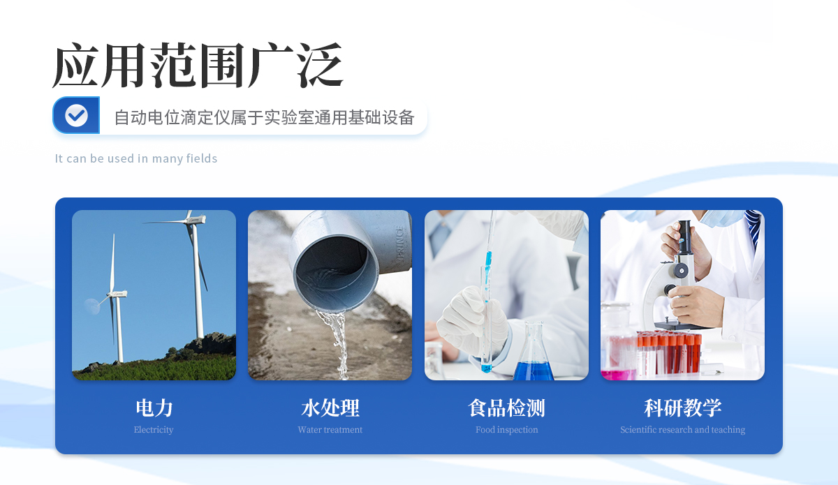 自動電位滴定儀屬于實驗室通用基礎設備,使用非常廣泛,可應用在食品、藥檢、疾控、商檢、水處理、石油、化工、海洋、電力、環保、新能源、教學、科研等相關領域。