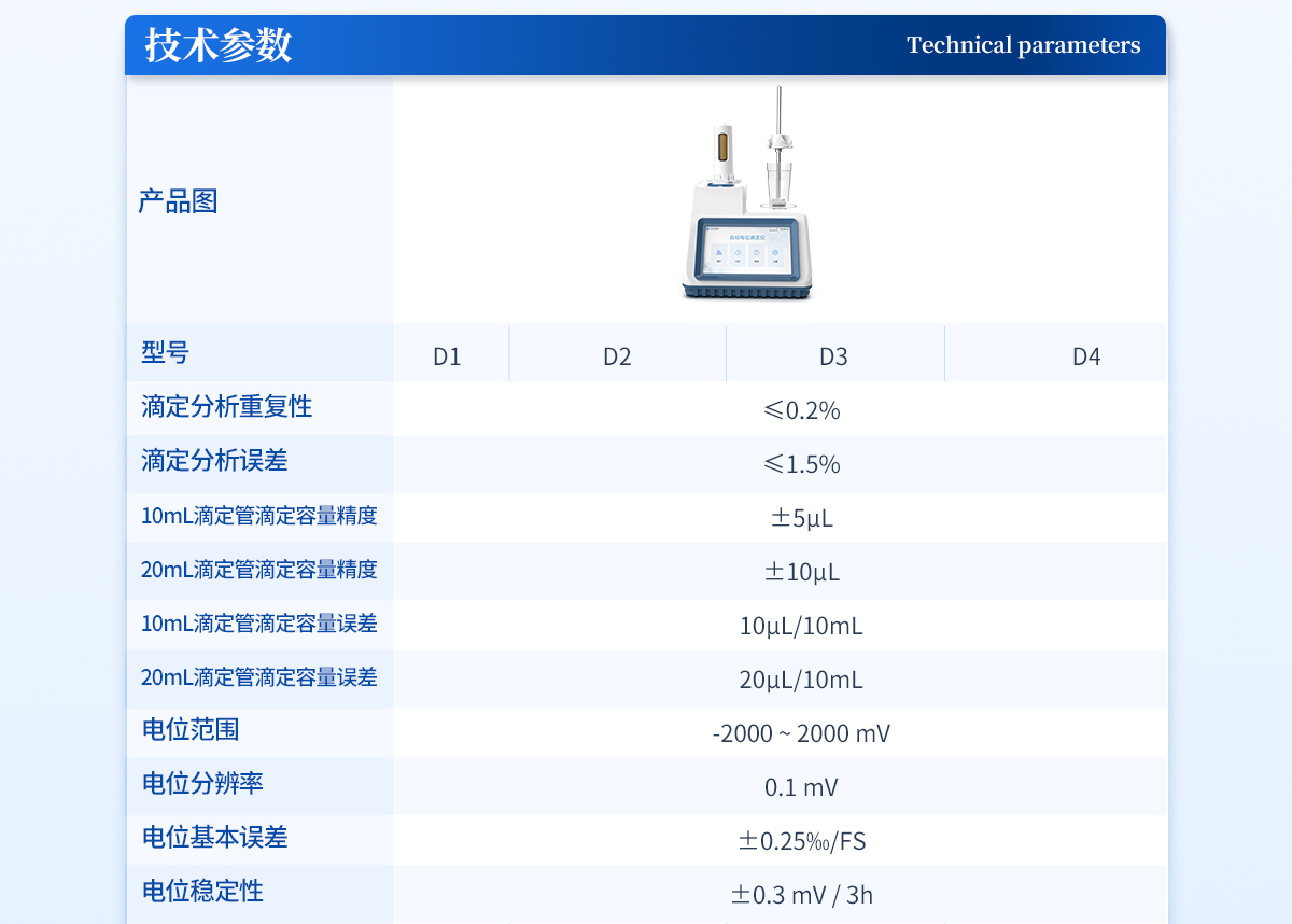 自動電位滴定儀是一種用于化學分析的精密儀器,他通過自動添加滴定劑來確定樣品中特定成分的濃度。該儀器基于電位滴定原理工作,即根據在滴定過程中電池電動勢的變化來確定滴定終點的一款滴定設備。設備滿足國家檢定規程JJG 814-2015《自動電位滴定儀》儀器級別中的0.05級別,即儀器**示值誤差為±1.5%,儀器示值重復性≤0.2%