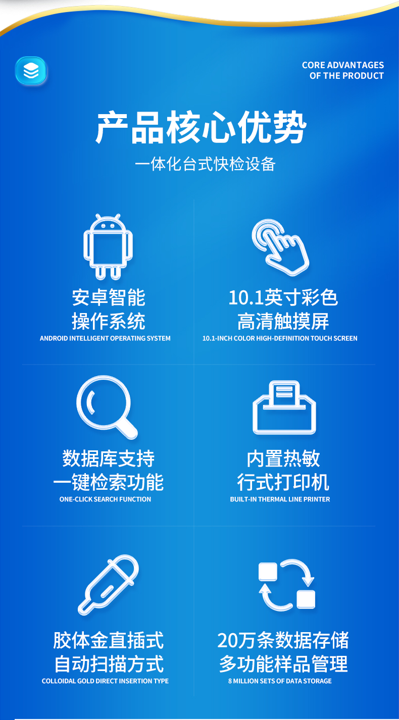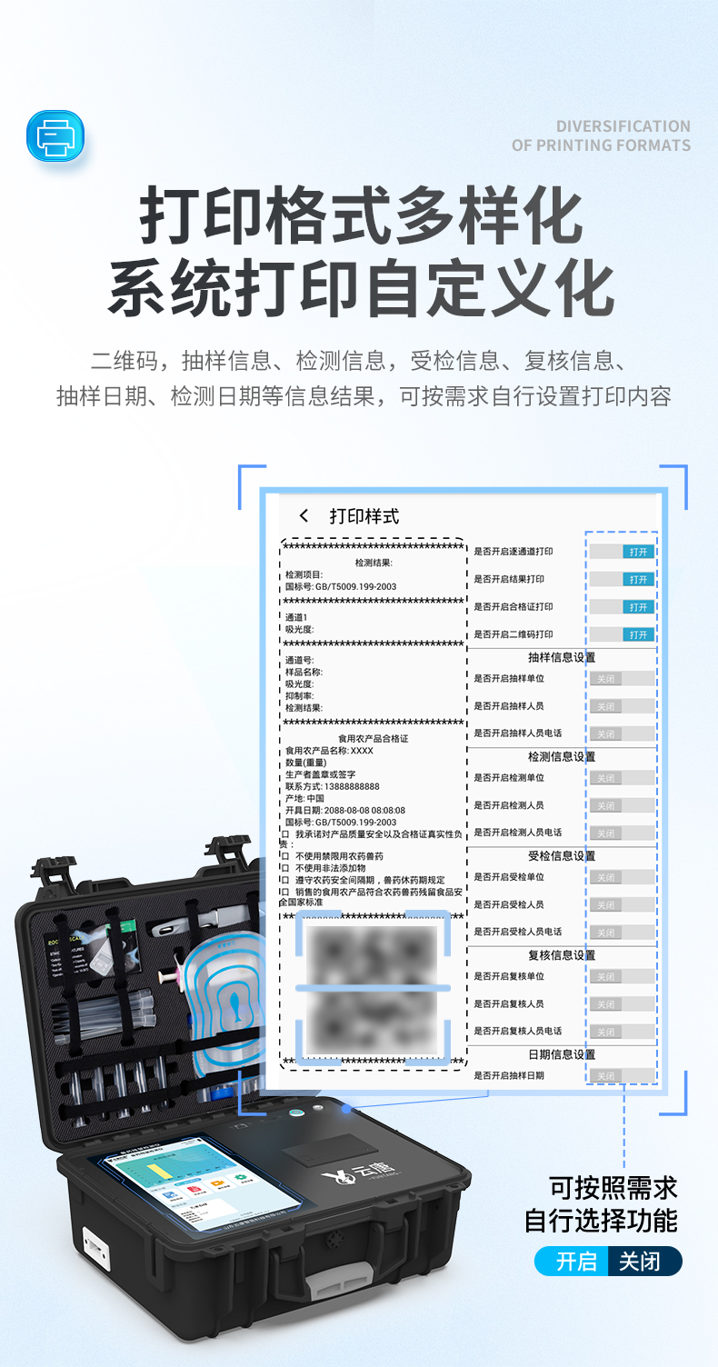 | 1、儀器采用10.1英寸液晶觸摸屏顯,搭配運行安卓智能操作系統,主控芯片采用ARM Cortex-A7,RK3288/4核處理器,主頻1.88Ghz,運轉速度更快速,性能更強。 | 2、儀器功能包括:膠體金檢測模塊、數字化管理模塊、無線通訊模塊等,可以滿足同一軟件下實現所有檢測項目的檢測,并在同一窗口展示檢測結果。 | 3、一體化便攜式快檢設備,采用交直流兩用供電方式,可連接車載電源,配備6ah大容量充電鋰電池,可以滿足現場及流動檢測使用的需求。儀器尺寸:43×35×20cm, 主機凈重:5.1kg | 4、系統自帶數據集成模塊,設備首頁自動統計檢測數據包含:周檢測數據、月檢測數據,全部檢測總數量,均包含檢測總數,合格數,不合格數,以及相關柱形分析圖,對各項檢測數據清晰掌握,無需電腦查詢,更加快捷直觀。 | 5、儀器具有任務預設模塊,可在樣品送檢前提前預設樣品名稱、檢測指標、送檢單位等信息,樣品送檢時一鍵調取保存信息,檢測更加方便快捷。 | 6、膠體金檢測模塊: 軌道式自動傳輸掃描方式,可實時顯示金標卡實時圖像,系統自動分析并呈現出CT曲線圖,CT線自動識別,無需手動調整,完成檢測后自動退出檢測卡。 結果判定線可修改,對照值標定值可保存,斷電不丟失數據。 兼容市場上其他膠體金卡,使用耗材不受限制,極大增強用戶使用體驗。 | 7、圖像調整功能:可根據金標卡讀取圖像進行多方位調整,使其更精準讀取結果。 | 8、儀器檢測系統擁有龐大數據庫,并且構建了完善的檢索、修訂功能。食品庫涵蓋多種樣品名稱,可按需添加或刪除、編輯樣品名稱;產品數據庫以及歷史檢測記錄支持一鍵檢索功能。 | 9、系統打印自定義化,打印格式多樣化,產品合格證(國家標準要求),二維碼,抽樣信息、檢測信息,受檢信息、復核信息、抽樣日期、檢測日期等信息結果,可按需求自行設置打印內容。 | 10、A4紙版本報告打印功能:設備擁有兩種結果展示方式,可以自動生成A4打印模板和小票打印模板兩種樣式,可通過WiFi及網線等方式鏈接外置打印機可進行打印 | 11、儀器具有 wifi 聯網上傳、RJ45網線連接功能,可以快速上傳數據。同步對接監管平臺,數據可局域網和互聯網數據上傳,檢測結果直接傳至食品安全監管平臺。進行區域食品安全監管及大數據分析處理與數據統計,檢測區域食品安全長短期動態,達到食品安全問題預估、預警。 | 12、設備支持U盤存儲,標準USB接口,免驅動安裝。檢測結果存儲容量20萬條以上,可生成Excel表格,進行一鍵拷貝,并具有登錄保護功能,可設置用戶名及密碼,規范不同人員操作權限,防止非工作人員操作,并且可以進行重新校準、鎖定、恢復出廠設置功能。儀器固件可升級,后期檢測項目可擴充。 | 13、儀器具備遠程升級功能,可定向分客戶分儀器更新,開機后自動更新,并可持續性免費更新系統版本,無需像傳統產品返廠更新,節省時間及人力成本并避免了物流運輸返廠升級導致設備損壞的潛在風險。 |