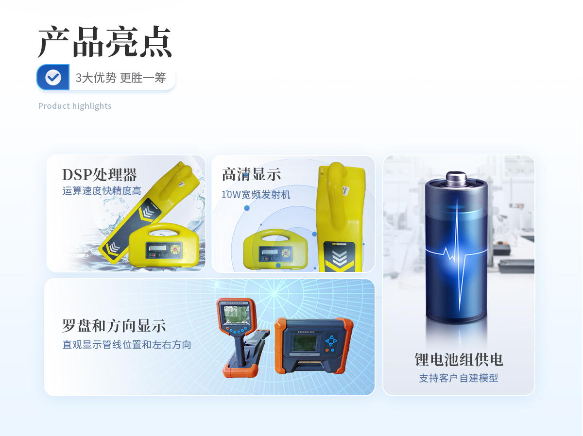 | 1、采用DSP處理器,運算速度快,精度更高; | 2、帶有導向功能指標管線走向,定位更快; | 3、采用10W寬頻發射機,適應各種環境的探測; | 4、接收機和發射機都采用鋰電池組供電,節能環保,每年可節省3000-5000元的電池費用。 |