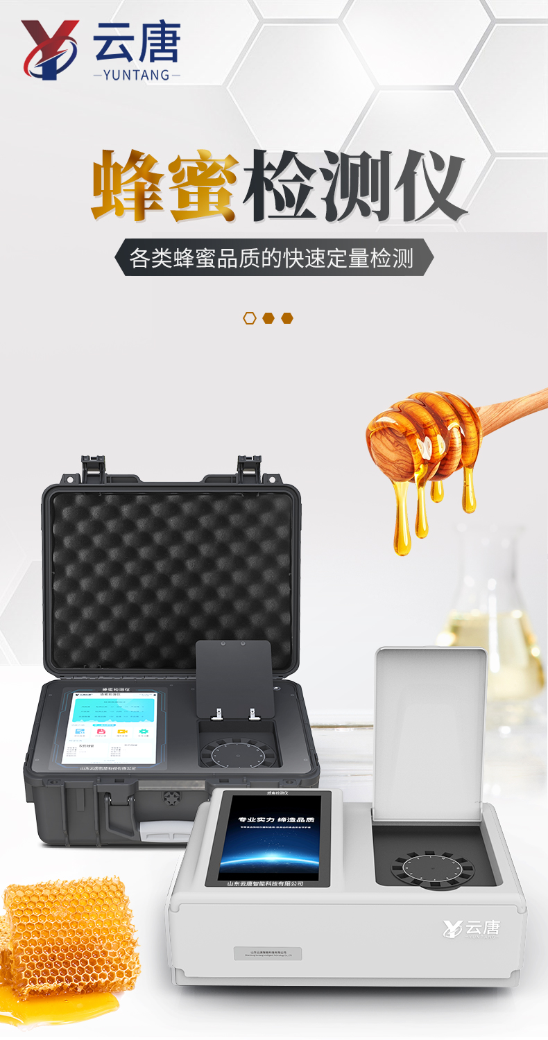 山東云唐智能科技有限公司生產的蜂蜜檢測儀為集成化食品安全快速檢測分析設備,采用手提箱式一體化設計,可檢測體現各類蜂蜜品質的蔗糖、還原糖(葡萄糖和果糖)、羥甲基糠醛、農藥殘留、獸藥殘留、重金屬等項目定性定量檢測。