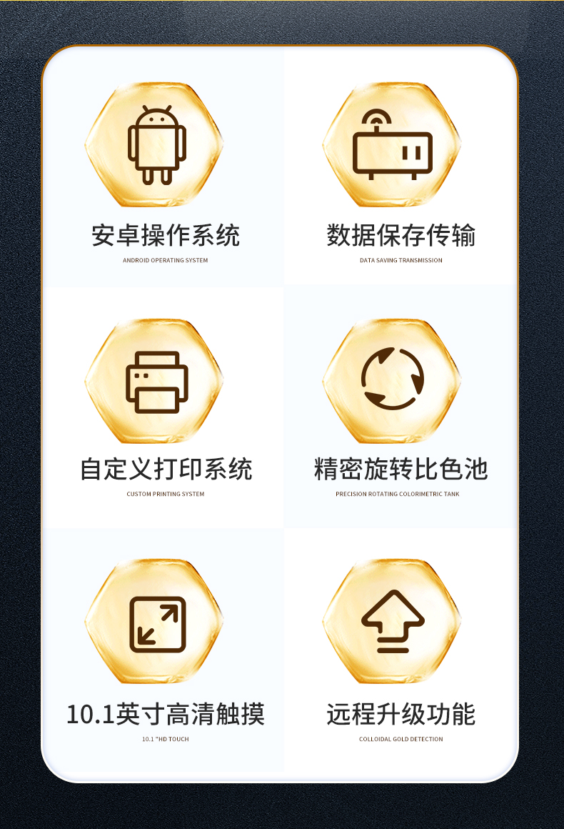 11、膠體金檢測模塊:采用CMOS成像處理技術及膠體金免疫層析技術,可讀取膠體金卡數據,自動采集、處理分析,將檢測結果顯示,并可根據參考限值自動判斷檢測結果,可檢測常見的獸藥殘留、生物毒素、抗生素、違禁添加物等。