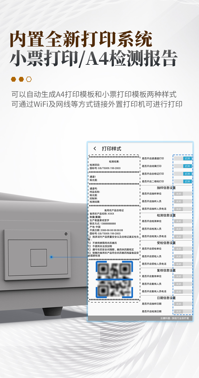 9.7.1、全新打印系統:內置全新打印機,新創自定義打印方式,可按需靈活勾選控制:產品合格證(國家農業部標準要求),二維碼,抽樣信息、檢測信息,受檢信息、復核信息、抽樣日期、檢測日期等信息的打印。