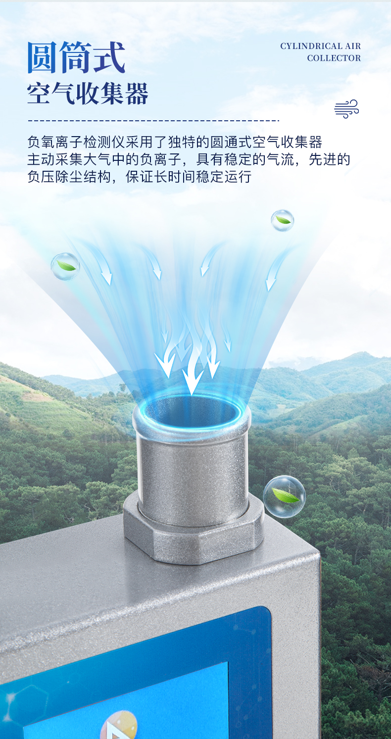 采用“電容式吸入法”原理進行負離子檢測,測量空氣中的負離子濃度值。在離子傳感器(或稱采集桶、采集筒)的極化板(或稱偏壓板)上加載定量的極化電壓,再讓被測空氣按設定速度勻速通過傳感器??諝庵刑囟ǖ男×截撾x子在電場的作用下發生偏轉,被采集板所捕獲。采集到的負離子負電荷量經過采集器的處理,即可計算出負離子的電荷濃度值。