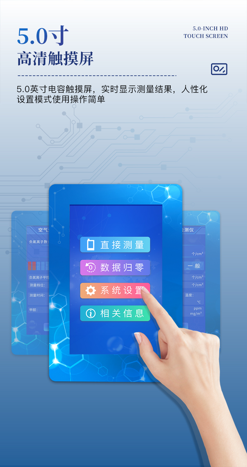 1、屏幕顯示:5.0英寸電容觸摸屏,800*480高分辨率,實時顯示負(氧)離子測量結果;