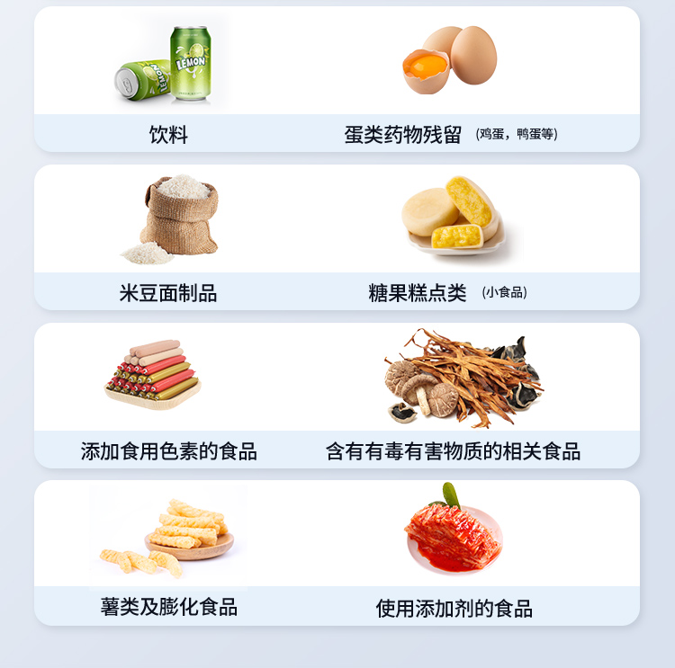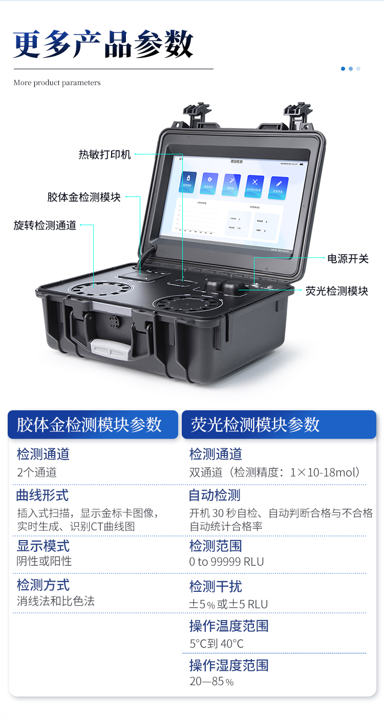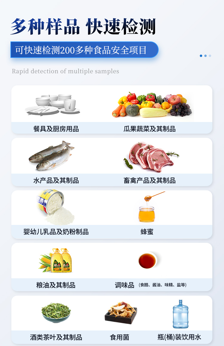 | 1. 功能構成:主要包括分光光度模塊、新型農殘檢測模塊、膠體金檢測模塊、熒光檢測模塊、數字化管理模塊等,所有模塊集成一體,可快速檢測200多種食品安全項目,如獸藥殘留、農藥殘留、非法添加劑、細菌數值等指標。 | 2. 檢測樣品種類:餐具及廚房用品、瓜果蔬菜及其制品、水產品及其制品、畜禽產品及其制品、嬰幼兒乳品及奶粉制品、蜂蜜、糧油及其制品、調味品(食醋、醬油、味精、鹽等)、酒類茶葉及其制品、食用菌、飲料、蛋類藥物殘留(雞蛋,鴨蛋等)、米豆面制品、糖果糕點類(小食品)、薯類及膨化食品、瓶(桶)裝飲用水、添加食用色素的食品、使用添加劑的食品、含有有毒有害物質的相關食品。 | 3、顯示屏幕:儀器采用15.6英寸液晶觸摸屏顯,搭配運行安卓智能操作系統,主控芯片采用ARM Cortex-A7,RK3288/4核處理器,主頻1.88Ghz,操作方便,性能更強。 | 4、供電模式:儀器交直流兩用,直流12V供電,可連接車載電源,配18ah大容量充電鋰電池,電量可實時顯示,無外部電源條件下可持續工作至少 4 小時。 | 5、檢測通道:≥24通道;采用精密旋轉比色池設計,使用同芯片同光源校準精度,解決不同光源之間的誤差值,更加準確**,采用高精度進口四波長冷光源,每個通道均配置 410、520、590、630nm 波長光源,標配**的光路切換裝置,**光路切換功能可實現64波長,并且所有檢測項目可實現所有通道同時檢測. | 6、通訊接口:配備無線通信模塊、4G(APN)通訊模塊、藍牙傳輸,同時具有雙USB接口以及RJ45網線接口,可以多方式實現數據保存及數據傳輸。 | 7、存儲方式:支持U盤存儲,兩個標準USB接口,免驅動安裝。檢測結果存儲容量20萬條以上,可生成Excel表格進行拷貝,并具有登錄保護功能。 | 8、操作系統:儀器可在同一檢測界面自動對應相關檢測通道,一次性選擇不少于11個樣品名稱,無需退出界面,節省操作時間。并可以對每個通道屬性和樣品信息單獨進行編輯,例如送檢單位、人員,檢測人員等,打印時勾選打印顯示。 | 9、數據集成系統:設備首頁自動匯總分析檢測數據,包含:周檢測數據、月檢測數據,全部檢測總數量,包含檢測總數,合格數,不合格數,以及相關柱形分析圖,各項檢測數據一目了然,無需電腦查詢,更加快捷直觀。 | 10、數據庫系統:十幾項數據庫分類管理儀器:包含項目類型、項目數據、檢測數據、歷史記錄、國標信息、曲線信息、采樣信息、檢測信息、受檢信息、復核信息、圖表信息、光源校準信息、打印樣式信息、樣品庫信息等等,數據庫之間互相協調聯動保證數據的真實完整性。同時產品數據庫以及歷史檢測記錄支持一鍵檢索功能。 | 11、限量規判系統:具有限量查詢、添加物質合規判定系統。檢測出結果后,系統自動調用系統數據庫中相關國標進行比對判定,客觀顯示判定結果是否合格。 | 12、項目預設系統:儀器具有任務預設模塊,一鍵提前預設,給出方便快捷的新檢測方案,每一個任務分別可以設置不同的樣品、批次、編號、來源、備注、抽樣信息、檢測信息、受檢信息、復核信息等更多信息。樣品送檢時一鍵調取保存信息,并可多次調取,適用于大批量檢測業務,可以大大提高檢測效率。 | 13、數據監管系統:同步對接監管平臺,數據可局域網和互聯網數據上傳,檢測結果可直接傳至食品安全監管平臺。進行區域食品安全監管及大數據分析處理與數據統計,監測區域食品安全長短期動態及問題預估、預警。 | 14.1、全新打印系統:內置全新打印機,新創自定義打印方式,可按需靈活勾選控制:產品合格證(國家農業部標準要求),二維碼,抽樣信息、檢測信息,受檢信息、復核信息、抽樣日期、檢測日期等信息的打印。 | 14.2、A4紙版本報告打印功能:設備擁有兩種結果展示方式,可以自動生成A4打印模板和小票打印模板兩種樣式,可通過WiFi及網線等方式連接外置打印機可進行打印。 | 15、膠體金檢測模塊:采用單通道CMOS成像處理技術及膠體金免疫層析技術,可讀取膠體金卡數據,自動采集、處理分析,將檢測結果顯示,并可根據參考限值自動判斷檢測結果,可檢測常見的獸藥殘留、生物毒素、抗生素、違禁添加物等。 | 15.1、可即時檢測單聯卡及三聯卡; | 15.2、檢測通道:2個通道; | 15.3、檢測方式:消線法和比色法; | 15.4、顯示模式:陰性或陽性; | 15.5、曲線形式:插入式掃描方式,顯示金標卡圖像,實時生成、識別CT曲線圖,無需手動調整。兼容市場上其他金標卡,使用耗材不受限制。 | 16、熒光檢測模塊:快速檢測水質中微生物、固體物細菌含量。利用“熒光素酶—熒光素體系”快速檢測三磷酸腺苷(ATP)。以ATP含量表明樣品中微生物與其他生物殘余得多少,用于判斷衛生狀況。 適用于食品、餐具、手、液體等表面及水質潔凈度的檢測。 | 16.1、檢測通道:雙通道 檢測精度:********** | 16.2、檢測范圍:0 to 99999 RLU | 16.3、檢測時間:15 秒 | 16.4、檢測干擾:±5﹪或±5 RLU | 16.5、操作溫度范圍:5℃到 40℃ | 16.6、操作濕度范圍:20—85﹪ | 16.7、開機 30 秒自檢、內置自校光源、自動判斷合格與不合格、自動統計合格率 。 | 17、儀器具備遠程升級功能,可定向分客戶分儀器更新,開機后自動更新,并可持續性免費更新系統版本,無需像傳統產品返廠更新,節省時間及人力成本并避免了物流運輸返廠升級導致設備損壞的潛在風險。 |