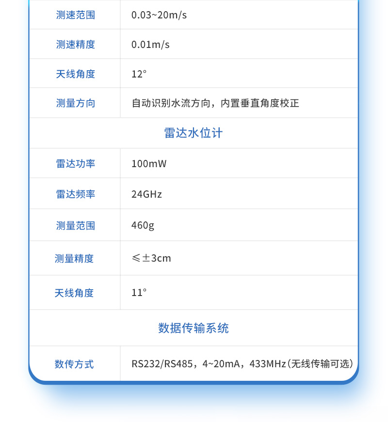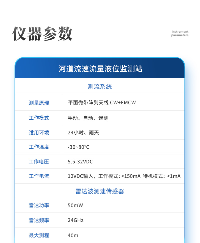 簡介:一、河道流速流量液位監測站介紹河道流速流量液位監測站是一款基于微波技術的全自動流量計,它采用**的K波段平面雷達技術,通過非接觸的方式測量水體的流速和水位,根據內置的軟件算法,計算并輸出實時斷面流量及累計流量;可用于河道、灌渠、地下排水管網、防汛預警等場合進行非接觸式流量測量;該產品具有功耗低、