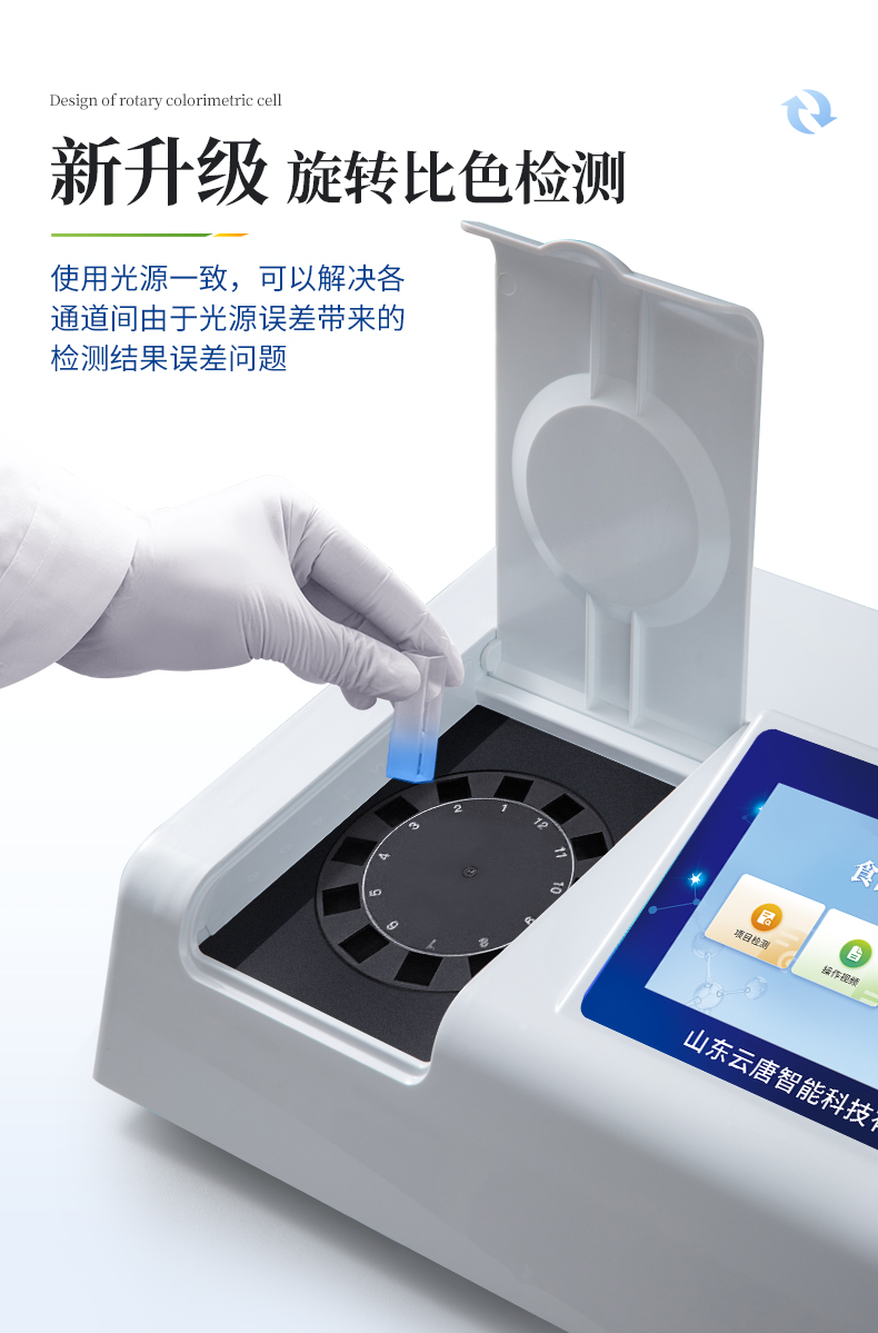 4、檢測通道:≥12通道;采用精密旋轉比色池設計,使用同芯片同光源校準精度,解決不同光源之間的誤差值,更加準確**。