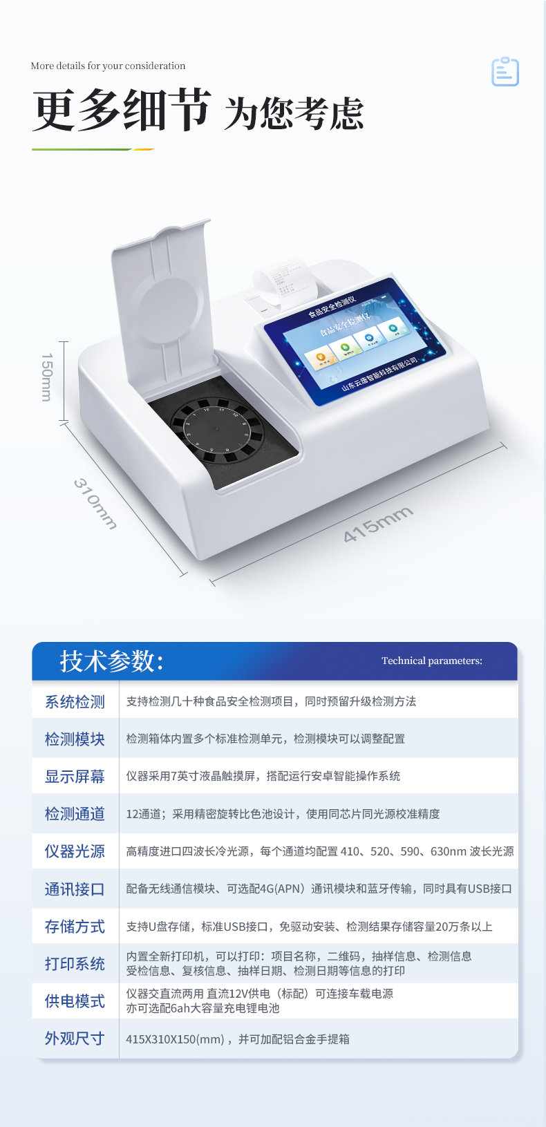 1、儀器采用臺式一體化系統檢測技術,將分光光度模塊、數字化管理模塊、無線通訊模塊高度集成于一體,支持檢測幾十種食品安全檢測項目,同時預留升級檢測方法。