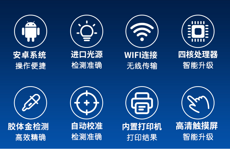 | 1、安卓智能操作系統,采用更加**和人性化操作,儀器具有網線連接、wifi聯網上傳、GPRS無線遠傳功能,快速上傳數據。 | 2、智能化程度高,儀器具有自檢功能:具有開機自檢和調零功能,具有自動檢測重復性功能。 | 3、新一代高速熱敏打印機,檢測完成可自動打印檢測報告和二維碼。 | 4、儀器帶有監管平臺,數據可局域網和互聯網數據上傳,檢測結果直接傳至食品安全監管平臺。進行區域食品安全監管及大數據分析處理與數據統計,檢測區域食品安全長短期動態,達到食品安全問題預估、預警 | 5、一體化主機,包含食品安全檢測模塊、多通道農藥殘留檢測模塊、膠體金免疫層析檢測模塊。 | 6、一體化便攜式快檢設備,滿足現場及流動檢測使用需求,能夠在同一軟件下實現所有檢測項目的檢測,并可通過同一窗口直觀顯示檢測結果。 | 7、膠體金模塊檢測方式:軌道式自動傳輸掃描,檢測完成后自動退出檢測卡。 | 8、CT線自動識別,無需手動調整。 | 9、儀器具有品類多種類樣品菜單庫,可靈活選擇檢測樣品,不同的檢測通道可同時檢測不同的樣品項目。 | 10、樣品處理簡單省力,整體操作快速、安全、便捷。 | 11、儀器具有自身保護功能,可設置用戶名及密碼,防止非工作人員操作等。 | 12、高靈敏度,高檢測精度,高重復性精度,掃描式高精度光學傳感器。 | 13、內置強大的數據庫,可在儀器上直接選擇樣品名稱、檢測指標、送檢單位等信息,也可在儀器上直接編輯錄入樣品名稱、檢測指標、送檢單位等信息并保存進樣品數據庫。 | 14、儀器具有重新校準、鎖定、恢復出廠設置功能。 | 15、結果判定線可修改,對照值標定值可保存,斷電不丟失數據。 | 16、兼容市場上所有的膠體金卡,使用耗材不受限制,極大增強用戶使用體驗。 |