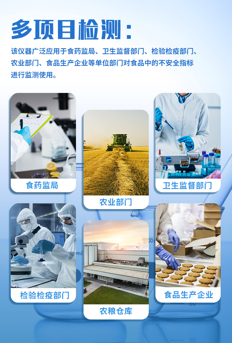 該儀器廣泛應用于食藥監局、衛生監督部門、農業部門、檢驗檢疫部門、食品生產企業等單位部門對食品中的不安全指標進行監測使用。
