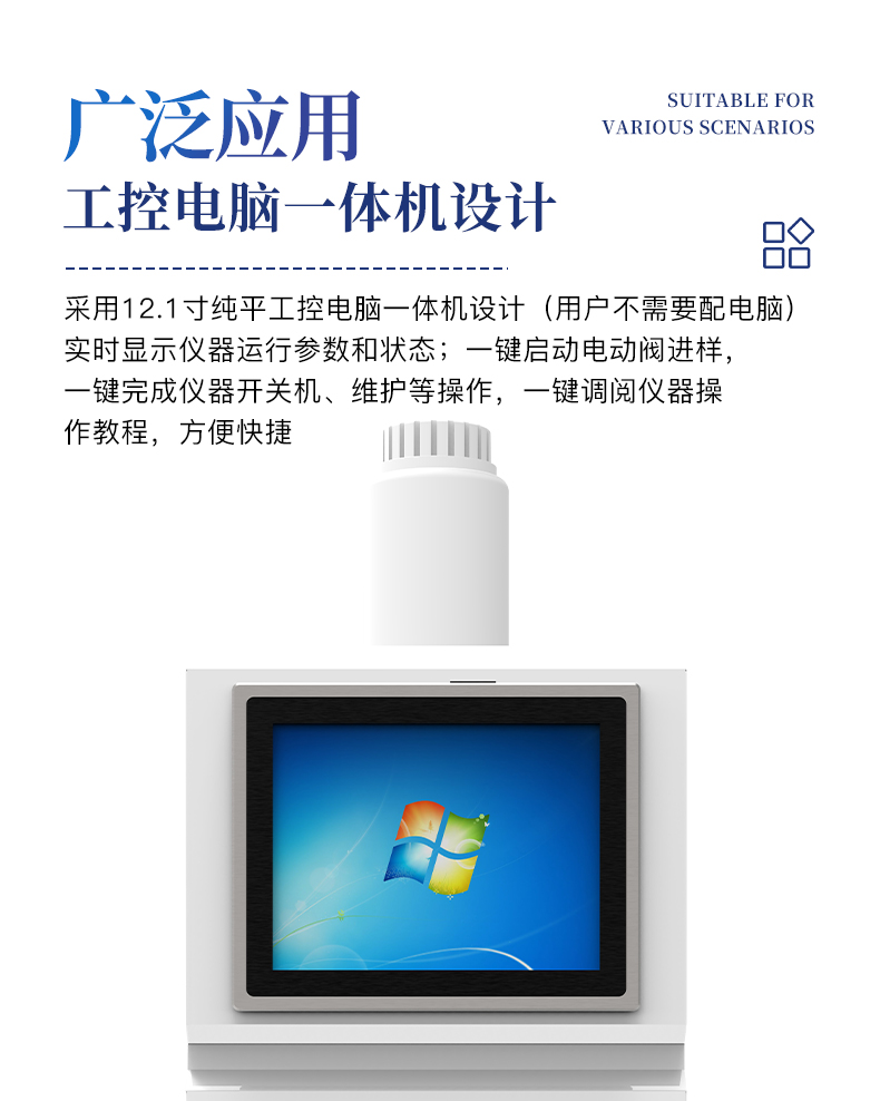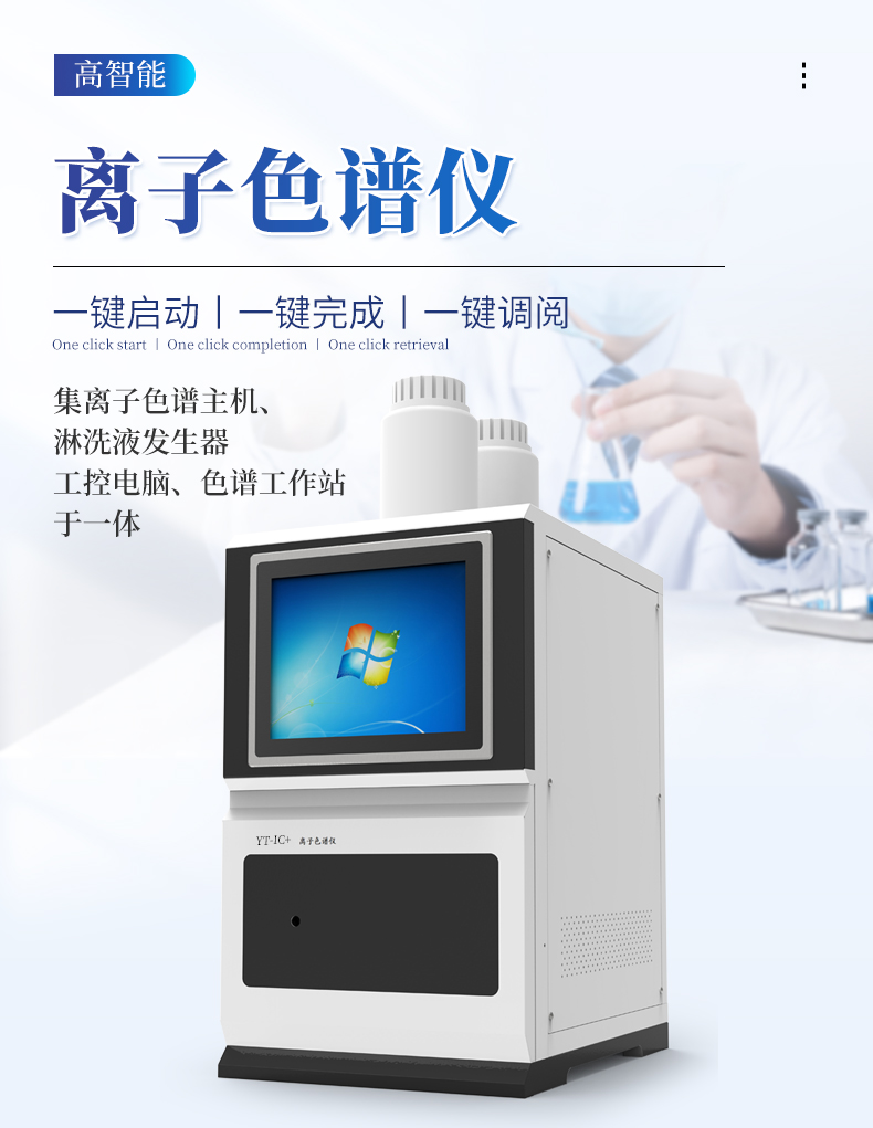 簡介:儀器簡介:全新一代離子色譜儀,采用12.1吋純平工控電腦一體機設計(用戶不需要配電腦),實時顯示儀器運行參數和狀態;一鍵啟動電動閥進樣,一鍵完成儀器開關機、維護等操作,一鍵調閱儀器操作教程,方便快捷。離子色譜儀核心零部件自主研發、自主知識產權可控。采用一體化設計,集離子色譜主機、淋洗液發生器、工控電腦、