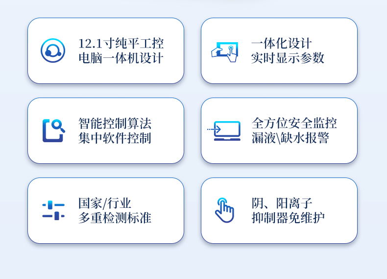 | 全新一代離子色譜儀,采用12.1吋純平工控電腦一體機設計(用戶不需要配電腦),實時顯示儀器運行參數和狀態;一鍵啟動電動閥進樣,一鍵完成儀器開關機、維護等操作,一鍵調閱儀器操作教程,方便快捷。 | 離子色譜儀核心零部件自主研發、自主知識產權可控。采用一體化設計,集離子色譜主機、淋洗液發生器、工控電腦、色譜工作站于一體,結構緊湊,流路*短,對流路造成的峰型擴展有很好的改善。一體化恒溫箱:色譜柱、抑制器、電導池、放大電路都處于同一恒溫系統,改善了電導檢測器的溫飄和基線噪聲。內置多處漏液報警器和缺水報警器,全方位安全監控。由PLC控制的各個部件統一到電腦顯示屏的集中軟件控制系統,操作方便,鼠標所見即所控。 |