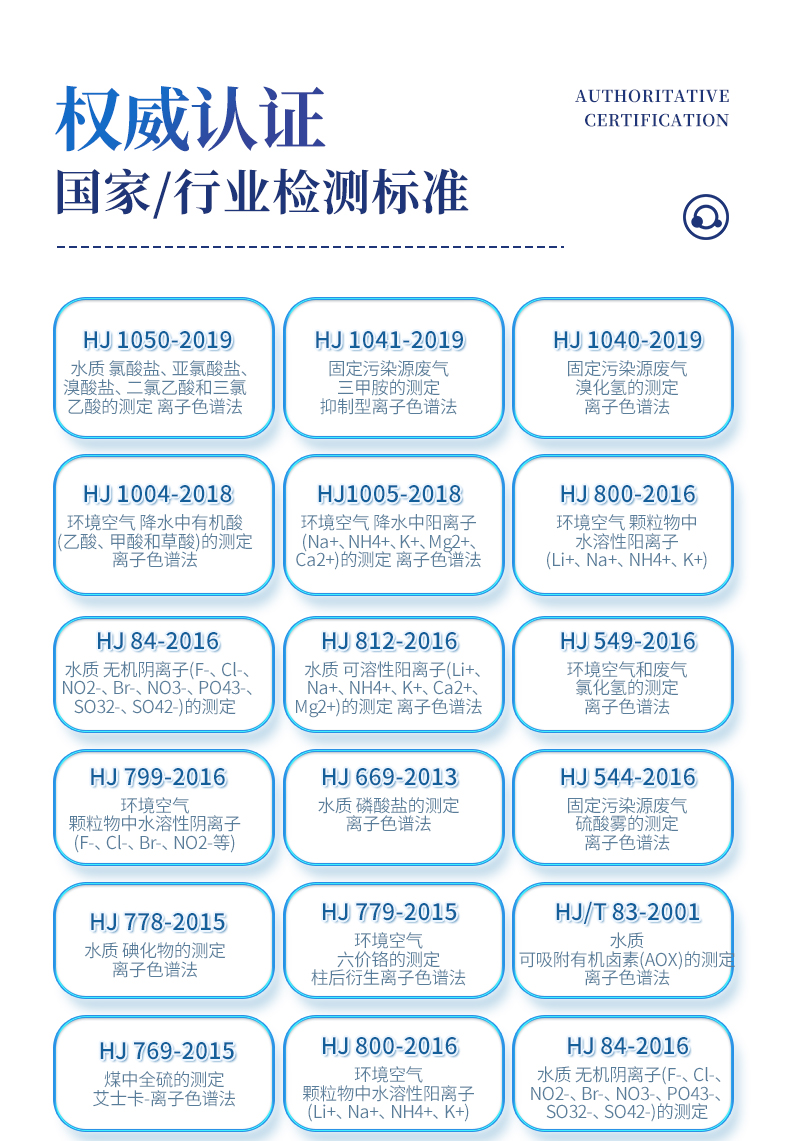 | HJ 1050-2019:水質 氯酸鹽、亞氯酸鹽、溴酸鹽、二氯乙酸和三氯乙酸的測定 離子色譜法 | HJ 1041-2019 固定污染源廢氣 三甲胺的測定 抑制型離子色譜法 | HJ 1040-2019 固定污染源廢氣 溴化氫的測定 離子色譜法 | HJ 1004-2018 環境空氣 降水中有機酸(乙酸、甲酸和草酸)的測定 離子色譜法 | HJ1005-2018 環境空氣 降水中陽離子(Na+、NH4+、K+、Mg2+、Ca2+)的測定 離子色譜法 | HJ 800-2016 環境空氣 顆粒物中水溶性陽離子(Li+、Na+、NH4+、K+) | HJ 84-2016 水質 無機陰離子(F-、Cl-、NO2-、Br-、NO3-、PO43-、SO32-、SO42-)的測定 | HJ 812-2016 水質 可溶性陽離子(Li+、Na+、NH4+、K+、Ca2+、Mg2+)的測定 離子色譜法 | HJ 549-2016 環境空氣和廢氣 氯化氫的測定 離子色譜法 | HJ 799-2016 環境空氣 顆粒物中水溶性陰離子(F-、Cl-、Br-、NO2-等) | HJ 669-2013 水質 磷酸鹽的測定 離子色譜法 | HJ 544-2016 固定污染源廢氣 硫酸霧的測定 離子色譜法 | HJ 778-2015 水質 碘化物的測定 離子色譜法 | HJ 779-2015 環境空氣 六價鉻的測定 柱后衍生離子色譜法 | HJ/T 83-2001 水質 可吸附有機鹵素(AOX)的測定 離子色譜法 | HJ 769-2015 煤中全硫的測定 艾士卡-離子色譜法 | HJ 800-2016 環境空氣 顆粒物中水溶性陽離子(Li+、Na+、NH4+、K+) | HJ 84-2016 水質 無機陰離子(F-、Cl-、NO2-、Br-、NO3-、PO43-、SO32-、SO42-)的測定 | GB 5009.245-2016 食品安全 食品中聚葡萄糖的測定 | GB 5009.258-2016 食品安全 食品中棉子糖的測定 | GB 5009.256-2016 食品安全 食品中多種磷酸鹽的測定 | GB 5009.255-2016 食品安全 食品中果聚糖的測定 | GB 5009.33-2016 食品安全 食品中亞硝酸鹽和硝酸鹽的測定 | GB 8538-2016 食品安全標準 飲用天然礦泉水檢驗方法 | GB/T 5750.5-2006 生活飲用水標準檢驗方法 無機非金屬指標 | GB/T 5750.10-2006 生活飲用水標準檢驗方法 消毒副產物指標 | GB/T 5750.6-2006 生活飲用水標準檢驗方法 金屬指標 | GB/T 31197-2014 無機化工產品 雜質陰離子的測定 離子色譜法 | GB/T 30906-2014 三聚磷酸鈉中三聚磷酸鈉含量的測定 離子色譜法 | GB/T 11446.7-2013 電子級水中痕量陰離子的離子色譜測試方法 | GB/T 29400-2012 化肥中微量陰離子的測定 離子色譜法 | GB/T 3884.12-2010 銅精礦化學分析方法 第12部分:氟和氯含量的測定 離子色譜法 | GB/T 6730.69-2010 鐵礦石 氟和氯含量的測定 離子色譜法 | GB/T 24876-2010 畜禽養殖污水中七種陰離子的測定 離子色譜法 | GB/T 23978-2009 液體染料 氯離子含量的測定 離子色譜法 | GB/T 14642-2009 工業循環冷卻水及鍋爐水中氟、氯、磷酸根、亞硝酸根、硝酸根和硫 | GB/T 15454-2009 工業循環冷卻水中鈉、銨、鉀、鎂和鈣離子的測定 離子色譜法 | GB/T 23710-2009 飼料中甜菜堿的測定 離子色譜法 | GB/T 21533-2008 蜂蜜中淀粉糖漿的測定 離子色譜法 | GB/T 20188-2006 小麥粉中溴酸鹽的測定 離子色譜法 | GB/T 13580.5-1992 大氣降水中氟、氯、亞硝酸鹽、硝酸鹽、硫酸鹽的測定 離子色譜法 | GB/T 32953-2016 肥料中三聚氰胺含量的測定 離子色譜法 | GB/T 11733-1989 居住區大氣中硫酸鹽衛生檢驗標準方法 離子色譜法 | HJ-1076 氨、甲胺、二甲胺、三甲胺測定 |