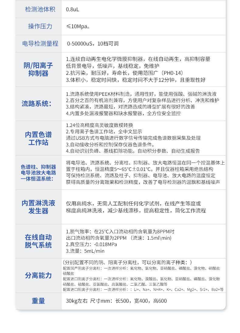 | 1 高壓輸液泵: 微處理器控制的雙柱塞往復泵,采用**的智能控制算法,能使泵的流量脈動降至**水平。 1.1,材質:鑲嵌式PEEK材料無阻尼泵頭,PEEK管路,適合于pH為0~14的淋洗液及反相有機溶劑。 1.2,流量范圍:0.001~9.999ml/min,增量0.001ml/min。 1.3,流量設定值誤差:≤0.1% 1.4,流量穩定性:≤0.1% 1.5,工作壓力:35MPa 1.6,過壓保護:工作壓力超過或低于設定的上限或下限時,泵將自行關閉且報警。 | 2 電導檢測器: 2.1,原理:五極電導檢測器 2.2,電極材料:鈍化316L不銹鋼 2.3,基線噪音:≤0.002μS/cm 2.4,基線漂移:≤0.008μS/cm·30min 2.5,zui小檢出濃度:≤0.0005ug/mL(以Cl-計) 2.6,儀器線性:≥0.9995 2.7,定量重復性:≤0.1%(以Cl-計) 2.8,定性重復性:≤0.1%(以Cl-計) 2.9,測量范圍:0~50000us/cm 2.10,分辨率:≤0.0020ns/cm 2.11,檢測池體積:0.8uL 2.12,操作壓力:≤10Mpa。 2.13,電導檢測量程: 0-50000uS,10檔可調。 | 3、 陰、陽離子抑制器: 3.1連續自動再生電化學微膜抑制器,在線自動再生,高抑制容量,低背景電導,低噪聲,基線穩定,免維護。 3.2抗污染,耐壓好,壽命長,使用范圍廣(PH0-14)。 3.3體積小,穩定時間快,穩定時間不大于12分鐘,且重現性好。 | 4 流路系統: 4.1流路系統使用PEEK材料制造,通用性好,能使用強酸、強堿的淋洗液。 4.2百分之百的有機溶劑兼容,方便用戶對復雜樣品進行分析、沖洗和維護。 4.3 結構緊湊,流路*短,對流路造成的峰型擴展有很好的改善。 4.4 內置多處漏液報警器和缺水報警器,全方位安全監控。 | 5 內置色譜工作站: 5.1 24位高精度高靈敏度數模轉換。 5.2專用離子色譜工作站,全中文顯示,通過USB方式與電腦進行數字信號傳輸,完成色譜數據采集及處理。 5.3自動接收分析和控制保存儀器色譜條件。 5.4自動識別負峰、基線扣除功能。自動積分參數、自動生成報告。 | 6 色譜柱、抑制器、電導池、放大電路一體恒溫系統: 將電導池、流路系統、分離柱、抑制器、放大電路恒溫在同一個控溫基體上置于柱箱內,恒溫精度5~65℃±0.01℃。并且儀器柱箱采用絕熱結構,可保持檢測系統、流路及柱子、抑制器、電導池、放大電路的溫度恒定,獲得高質量的分離效果和檢測精度,改善了電導檢測器的溫飄和基線噪聲。 | 7內置淋洗液發生器,僅用高純水,無需人工配制任何化學試劑,在線產生等度或梯度高純淋洗液,減少基線漂移,提高穩定性,簡化工作流程。 | 8 在線自動脫氣系統: 1,脫氣效率:在25℃入口流動相的含氧量為8PPM時,出口流動相的含氧量為2PPM (流速:1.5ml\min) 2,真空壓力:-0.018MPa 3,流量:5mL/min | 9 分離能力:(分別配置不同的陰、陽離子分離柱,可以分離的離子種類:) 配置國產陰離子分離柱:一次進樣分析:氟化物、氯化物、亞硝酸鹽、磷酸鹽、溴化物、硝酸鹽、硫酸鹽 配置進口陰離子分離柱:一次進樣分析:氟化物、溴酸鹽、氯化物、亞硝酸鹽、磷酸鹽、溴化物、硝酸鹽、硫酸鹽、亞氯酸鹽、高氯酸鹽、二氯乙酸、三氯乙酸等 配置進口陽離子分離柱:一次進樣分析::Li+、Na+、NH4+、K+、Ca2+、Mg2+、Sr2+、Ba2+等 | 10 重量:30kg左右 尺寸mm:長500,寬400,高600 |