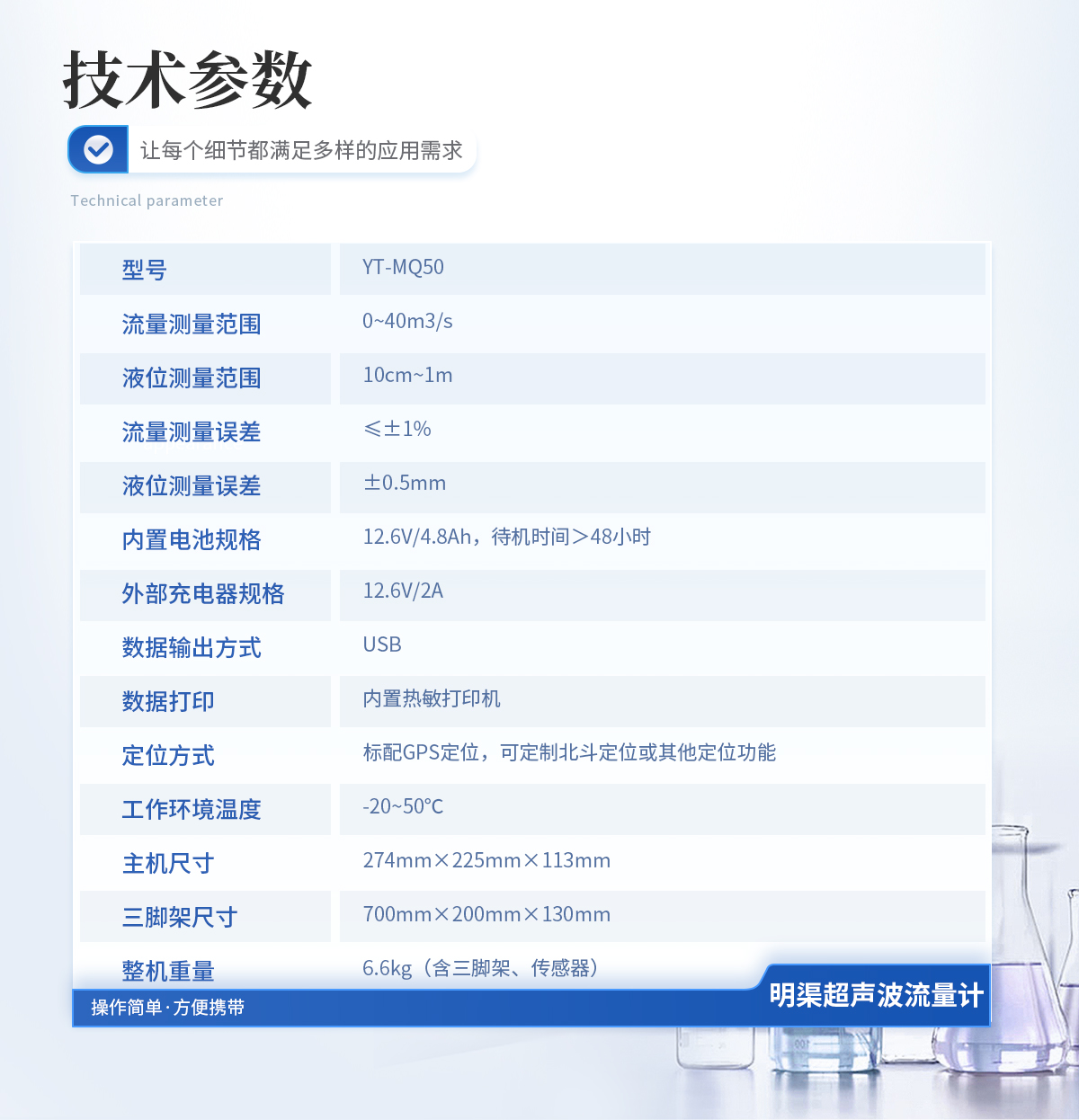 流量測量范圍 0~40m3/s 流量測量頻次 3次/秒 液位測量誤差 ≤0.5mm 流量測量誤差 ≤±1% 液位分辨率 0.1mm 探測距離 標(biāo)配1米,可選配2米 信號輸出方式 USB 工作環(huán)境濕度 ≤85% 工作環(huán)境溫度 -20℃~+50℃v 工作電源 AC220V ±15% 內(nèi)置電池 16.8V/2.6Ah 電池供電連續(xù)工作時間 >72 小時 外形尺寸 270mm×215mm×105mm 整機重量 2.4Kg