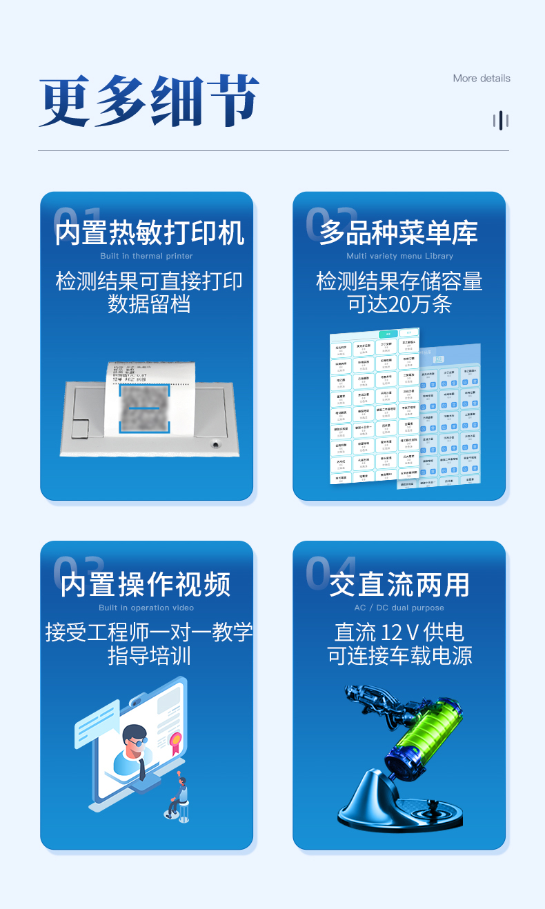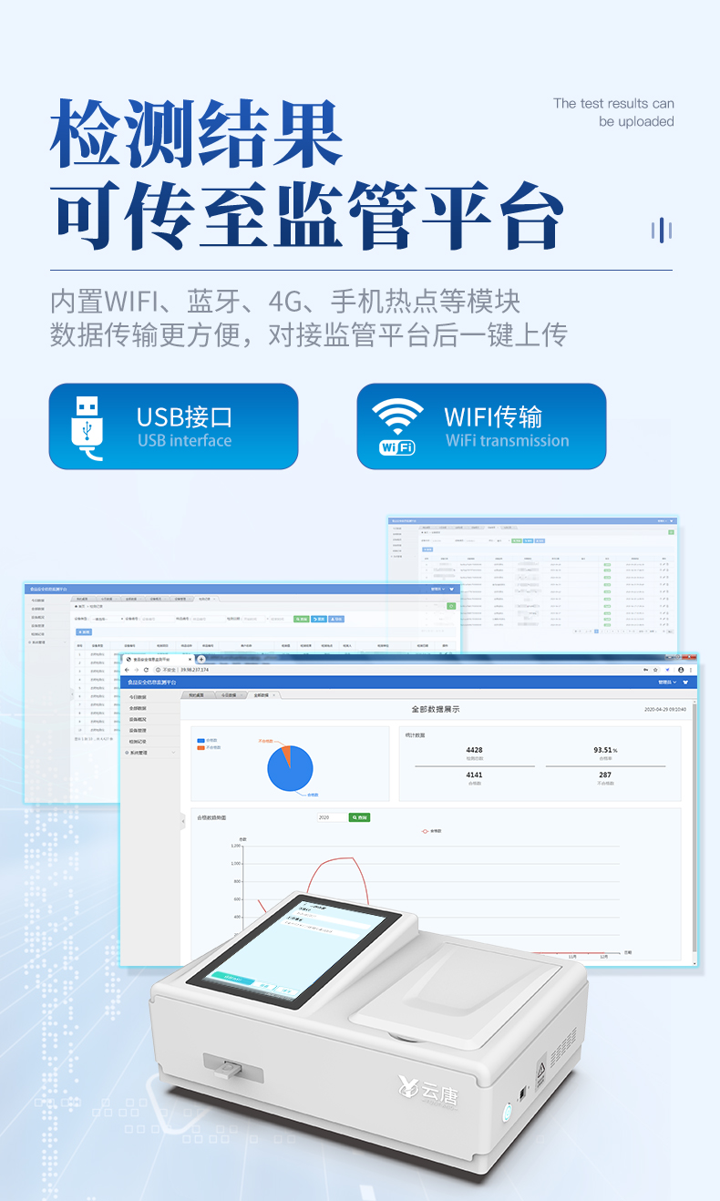 | 儀器采用手提一體化系統檢測技術,將分光光度模塊、數字化管理模塊、無線通訊模塊高度集成于一體,可支持檢測60種食品安全檢測項目,同時預留升級檢測方法。 | 儀器檢測模塊標準化、智能化,檢測項目可隨意自由組合。檢測箱體內置多個標準檢測單元,檢測模塊可以調整配置。 | 顯示屏幕:儀器采用10.1英寸豎向液晶觸摸屏顯,搭配運行安卓智能操作系統,主控芯片采用ARM Cortex-A7,RK3288/4核處理器,主頻1.88Ghz,操作方便,性能更強。 | 檢測通道:≥12通道;采用精密旋轉比色池設計,使用同芯片同光源校準精度,解決不同光源之間的誤差值,更加準確**。(1-12通道間誤差0.1%,**號:**202022821055.2) | 儀器光源:高精度進口四波長冷光源,每個通道均配置 410、520、590、630nm 波長光源,標配**的光路切換裝置,**光路切換功能可實現64波長,并且所有檢測項目可實現所有通道同時檢測。 | 設備可一鍵校準,自動保存校準數據,自動對比校驗,得到精準光源,采用Android SP存儲數據,光源數據永不丟失,方便每一次使用。 | 通訊接口:配備無線通信模塊、4G(APN)通訊模塊、藍牙傳輸,同時具有雙USB接口以及RJ45網線接口,可以多方式實現數據保存及數據傳輸。 | 存儲方式:支持U盤存儲,標準USB接口,免驅動安裝。檢測結果存儲容量20萬條以上,可生成Excel表格進行拷貝,并具有登錄保護功能。 | 智能化操作系統: | 1、操作系統:儀器可在同一檢測界面自動對應相關檢測通道,一次性選擇1-12個樣品名稱,無需退出界面,節省操作時間。并可以對每個通道屬性和樣品信息單獨進行編輯,例如送檢單位、人員,檢測人員等,打印時勾選打印顯示。 | 2、數據集成系統:設備首頁自動匯總分析檢測數據,包含:周檢測數據、月檢測數據,全部檢測總數量,均包含檢測總數,合格數,不合格數,以及相關柱形分析圖,各項檢測數據一目了然,無需電腦查詢,更加快捷直觀。 | 3、數據庫系統:十幾項數據庫分類管理儀器:包含項目類型、項目數據、檢測數據、歷史記錄、國標信息、曲線信息、采樣信息、檢測信息、受檢信息、復核信息、圖表信息、光源校準信息、打印樣式信息、樣品庫信息等等,數據庫之間互相協調聯動保證數據的真實完整性。同時產品數據庫以及歷史檢測記錄支持一鍵檢索功能。 | 4、限量規判系統:具有限量查詢、添加物質合規判定系統。檢測出結果后,系統自動調用系統數據庫中相關國標進行比對判定,客觀顯示判定結果是否合格。 | 5、項目預設系統:儀器具有任務預設模塊,一鍵提前預設,給出方便快捷的新檢測方案,每一個任務分別可以設置不同的樣品、批次、編號、來源、備注、抽樣信息、檢測信息、受檢信息、復核信息等更多信息。樣品送檢時一鍵調取保存信息,并可多次調取,大大提高檢測效率。 | 6、數據監管系統:同步對接監管平臺,數據可局域網和互聯網數據上傳,檢測結果可選擇直接傳至食品安全監管平臺。進行區域食品安全監管及大數據分析處理與數據統計,檢測區域食品安全長短期動態,達到食品安全問題預估、預警。 | 7.1、全新打印系統:內置全新打印機,新創自定義打印方式,可按需靈活勾選控制:二維碼,抽樣信息、檢測信息,受檢信息、復核信息、抽樣日期、檢測日期等信息的打印。 | 7.2、A4紙版本報告打印功能(可選配):設備擁有兩種結果展示方式,可以自動生成A4打印模板和小票打印模板兩種樣式,可通過WiFi及網線等方式鏈接外置打印機可進行打印。 | 供電模式:儀器交直流兩用,直流12V供電,可連接車載電源,可配6ah大容量充電鋰電池,電量可實時顯示,方便戶外流動測試。 | 儀器具備遠程升級功能,可定向分客戶分儀器更新,開機后自動更新,并可持續性免費更新系統版本,無需像傳統產品返廠更新,節省時間及人力成本并避免了物流運輸返廠升級導致設備損壞的潛在風險。 |