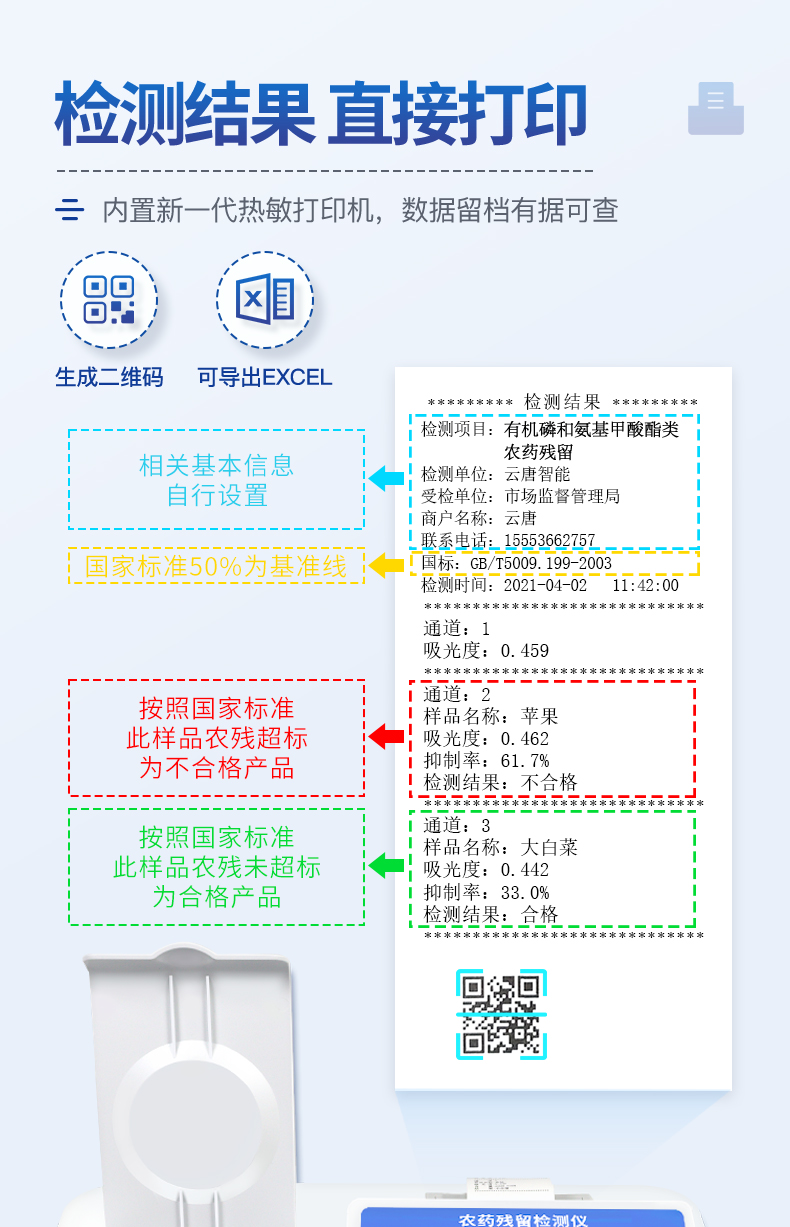 | 乙酰膽堿酯酶和丁酰膽堿酯酶試劑均可以使用,符合國家標準和農(nóng)業(yè)部標準的要求。 | 自動判斷樣品是否合格,檢測結果更加直觀。 | 儀器具有100多種蔬菜名稱菜單庫,分類管理,并可按需添加或刪除蔬菜名,編輯蔬菜名稱,可直接打印出蔬菜名稱。 | 檢測通道:12個檢測通道,可以同時測試多個樣品,循環(huán)檢測,即放即檢,每個樣品由程序控制分別獨立工作,不會互相干擾。 | 智能操作系統(tǒng),采用更加人性化操作,主控采用多核處理器,主頻1.88Ghz,運轉(zhuǎn)速度更快速,穩(wěn)定性更強。 | 顯示方式:7英寸高靈敏真彩觸摸屏顯示,人性化中文操作界面,讀數(shù)直觀、簡單。 | 打印機采用串口5v打印,可選擇手動打印或者自動打印,三分鐘出打印結果,打印格式為檢測人姓名、吸光度差值、檢測時間、檢測機構、樣品名稱及結果判定。 | 光源采用進口超高亮發(fā)光二極管,具有低功耗、高精度、穩(wěn)定性強、光源可控可以關掉不使用的光源,響應速度快等優(yōu)點。 | 智能恒流穩(wěn)壓,光強自動校準,長時間連續(xù)工作光源無溫漂現(xiàn)象。 | 儀器具有GPRS遠傳功能,可插手機卡實現(xiàn)數(shù)據(jù)遠傳平臺,wifi聯(lián)網(wǎng)功能,可將數(shù)據(jù)快速上傳電腦,進行數(shù)據(jù)管理與統(tǒng)計。 | 采用USB2.0接口設計,方便數(shù)據(jù)的存貯和移動,并可隨時與計算機直接相連,并且可用計算機控制儀器。實現(xiàn)數(shù)據(jù)查詢、瀏覽、分析、統(tǒng)計、打印等。 | 智能化程度高,儀器具有自檢功能:具有開機自檢和調(diào)零功能,具有自動檢測重復性功能 | 儀器具有自身保護功能,可設置用戶名及密碼,防止非工作人員操作等。 | 采用DC12v直流供電,安全系統(tǒng)更高,并且配備6A鋰電池充電器。 | 儀器具有重新校準、鎖定、恢復出廠設置功能。 |