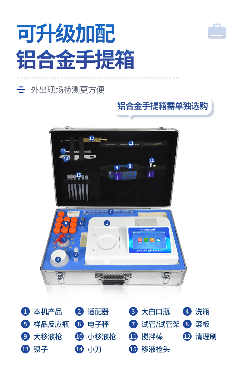 乙酰膽堿酯酶和丁酰膽堿酯酶試劑均可以使用,符合國家標準和農業部標準的要求。 自動判斷樣品是否合格,檢測結果更加直觀。儀器具有100多種蔬菜名稱菜單庫,分類管理,并可按需添加或刪除蔬菜名,編輯蔬菜名稱,可直接打印出蔬菜名稱。 檢測通道:12個檢測通道,可以同時測試多個樣品,循環檢測,即放即檢,每個樣品由程序控制分別獨立工作,不會互相干擾。智能操作系統,采用更加人性化操作,主控采用多核處理器,主頻1.88Ghz,運轉速度更快速,穩定性更強。 顯示方式:7英寸高靈敏真彩觸摸屏顯示,人性化中文操作界面,讀數直觀、簡單。打印機采用串口5v打印,可選擇手動打印或者自動打印,三分鐘出打印結果,打印格式為檢測人姓名、吸光度差值、檢測時間、檢測機構、樣品名稱及結果判定。 光源采用進口超高亮發光二極管,具有低功耗、高精度、穩定性強、光源可控可以關掉不使用的光源,響應速度快等優點。智能恒流穩壓,光強自動校準,長時間連續工作光源無溫漂現象。 儀器具有GPRS遠傳功能,可插手機卡實現數據遠傳平臺,wifi聯網功能,可將數據快速上傳電腦,進行數據管理與統計。采用USB2.0接口設計,方便數據的存貯和移動,并可隨時與計算機直接相連,并且可用計算機控制儀器。實現數據查詢、瀏覽、分析、統計、打印等。 智能化程度高,儀器具有自檢功能:具有開機自檢和調零功能,具有自動檢測重復性功能儀器具有自身保護功能,可設置用戶名及密碼,防止非工作人員操作等。 采用DC12v直流供電,安全系統更高,并且配備6A鋰電池充電器。儀器具有重新校準、鎖定、恢復出廠設置功能。