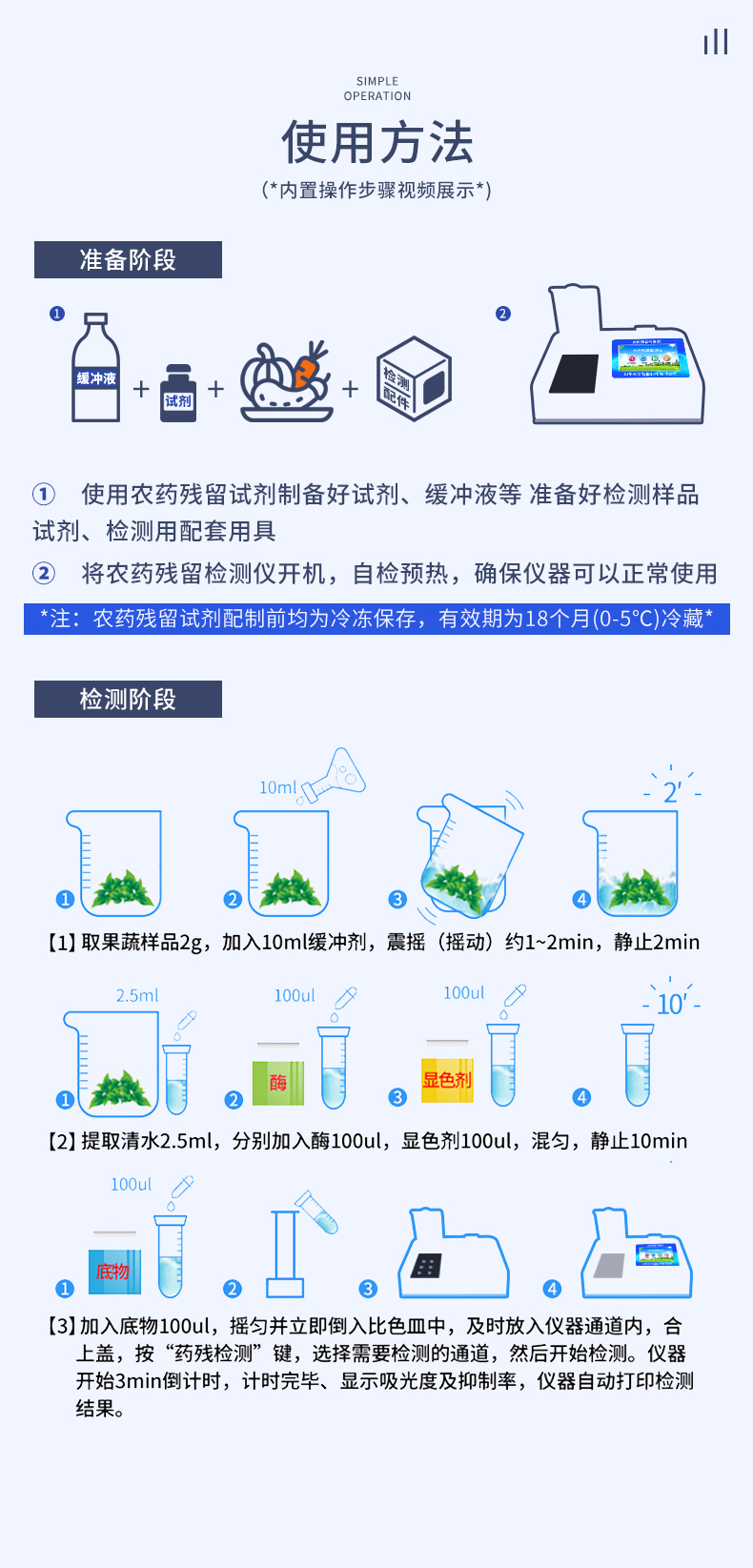 檢測標(biāo)準(zhǔn):依據(jù)國家標(biāo)準(zhǔn)方法(GB/T5009.199-2003)以及世界衛(wèi)生組織WHO、世界糧農(nóng)組織FAO殘留農(nóng)藥檢測標(biāo)準(zhǔn)、世界環(huán)境保護(hù)局EPA參照攝入量等要求來設(shè)計(jì)。采用酶抑制率比色法對水果、蔬菜等農(nóng)林產(chǎn)品中有機(jī)磷和氨基甲酸酯類農(nóng)藥含量進(jìn)行快速準(zhǔn)確的檢測,乙酰膽堿酯酶和丁酰膽堿酯酶試劑均可以使用,符合國家標(biāo)準(zhǔn)和農(nóng)業(yè)部標(biāo)準(zhǔn)的要求。