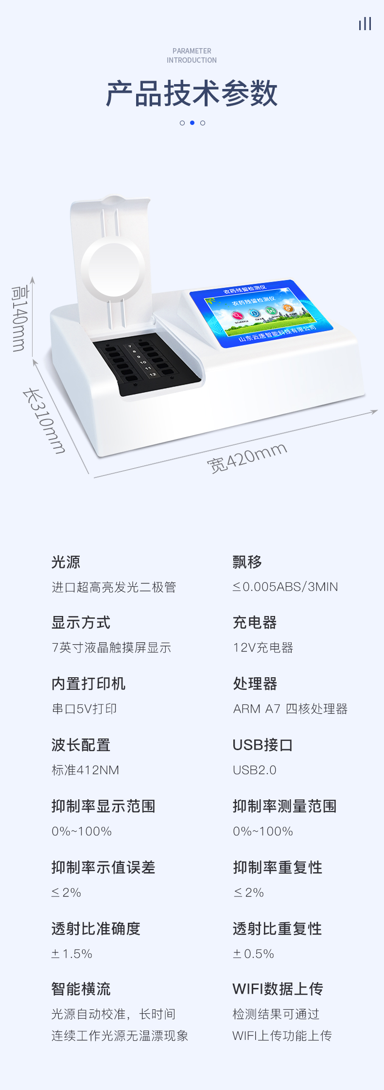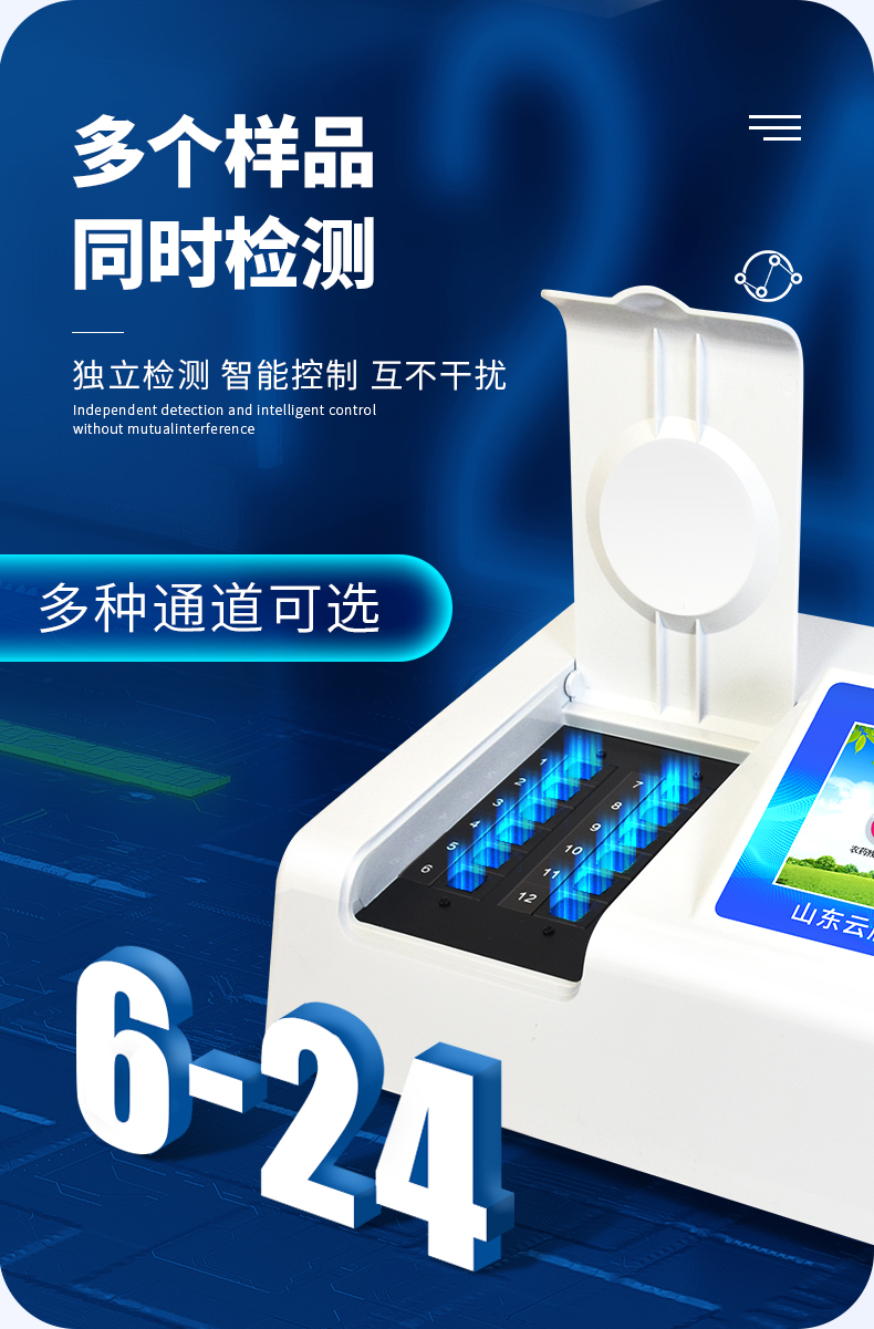 | 乙酰膽堿酯酶和丁酰膽堿酯酶試劑均可以使用,符合國家標(biāo)準(zhǔn)和農(nóng)業(yè)部標(biāo)準(zhǔn)的要求。 | 自動判斷樣品是否合格,檢測結(jié)果更加直觀。 | 儀器具有100多種蔬菜名稱菜單庫,分類管理,并可按需添加或刪除蔬菜名,編輯蔬菜名稱,可直接打印出蔬菜名稱。 | 檢測通道:12個檢測通道,可以同時(shí)測試多個樣品,循環(huán)檢測,即放即檢,每個樣品由程序控制分別獨(dú)立工作,不會互相干擾。 | 智能操作系統(tǒng),采用更加人性化操作,主控采用多核處理器,主頻1.88Ghz,運(yùn)轉(zhuǎn)速度更快速,穩(wěn)定性更強(qiáng)。 | 顯示方式:7英寸高靈敏真彩觸摸屏顯示,人性化中文操作界面,讀數(shù)直觀、簡單。 | 打印機(jī)采用串口5v打印,可選擇手動打印或者自動打印,三分鐘出打印結(jié)果,打印格式為檢測人姓名、吸光度差值、檢測時(shí)間、檢測機(jī)構(gòu)、樣品名稱及結(jié)果判定。 | 光源采用進(jìn)口超高亮發(fā)光二極管,具有低功耗、高精度、穩(wěn)定性強(qiáng)、光源可控可以關(guān)掉不使用的光源,響應(yīng)速度快等優(yōu)點(diǎn)。 | 智能恒流穩(wěn)壓,光強(qiáng)自動校準(zhǔn),長時(shí)間連續(xù)工作光源無溫漂現(xiàn)象。 | 儀器具有GPRS遠(yuǎn)傳功能,可插手機(jī)卡實(shí)現(xiàn)數(shù)據(jù)遠(yuǎn)傳平臺,wifi聯(lián)網(wǎng)功能,可將數(shù)據(jù)快速上傳電腦,進(jìn)行數(shù)據(jù)管理與統(tǒng)計(jì)。 | 采用USB2.0接口設(shè)計(jì),方便數(shù)據(jù)的存貯和移動,并可隨時(shí)與計(jì)算機(jī)直接相連,并且可用計(jì)算機(jī)控制儀器。實(shí)現(xiàn)數(shù)據(jù)查詢、瀏覽、分析、統(tǒng)計(jì)、打印等。 | 智能化程度高,儀器具有自檢功能:具有開機(jī)自檢和調(diào)零功能,具有自動檢測重復(fù)性功能 | 儀器具有自身保護(hù)功能,可設(shè)置用戶名及密碼,防止非工作人員操作等。 | 采用DC12v直流供電,安全系統(tǒng)更高,并且配備6A鋰電池充電器。 | 儀器具有重新校準(zhǔn)、鎖定、恢復(fù)出廠設(shè)置功能。 |