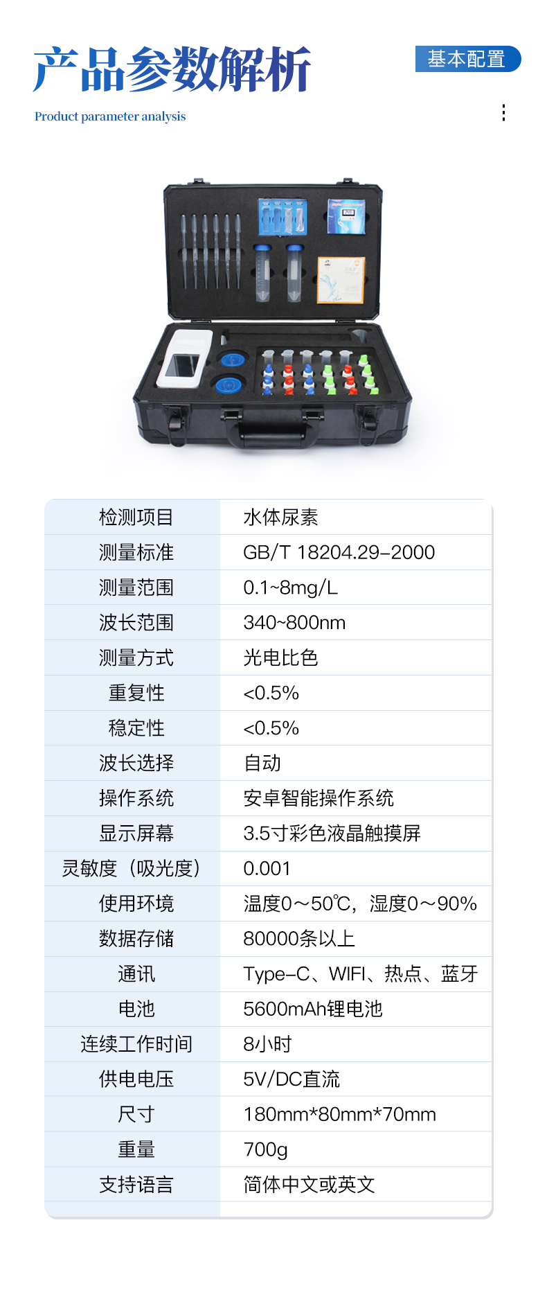 簡(jiǎn)介:水質(zhì)尿素檢測(cè)儀產(chǎn)品概述:YT-NS水質(zhì)檢測(cè)儀是一款適用于游泳場(chǎng)館、戶內(nèi)外游泳池、水上樂園、溫泉浴池、等領(lǐng)域的檢測(cè)儀,配合快速顯色檢測(cè)試劑,可“快速、簡(jiǎn)單、準(zhǔn)確、穩(wěn)定”進(jìn)行測(cè)量,擁有精美的外觀造型,簡(jiǎn)單的操作界面,準(zhǔn)確的檢測(cè)系統(tǒng),幫助用戶獲得精細(xì)的數(shù)據(jù),可更準(zhǔn)確、有效的分析水體狀況,提前預(yù)防養(yǎng)殖風(fēng)險(xiǎn),及時(shí)避