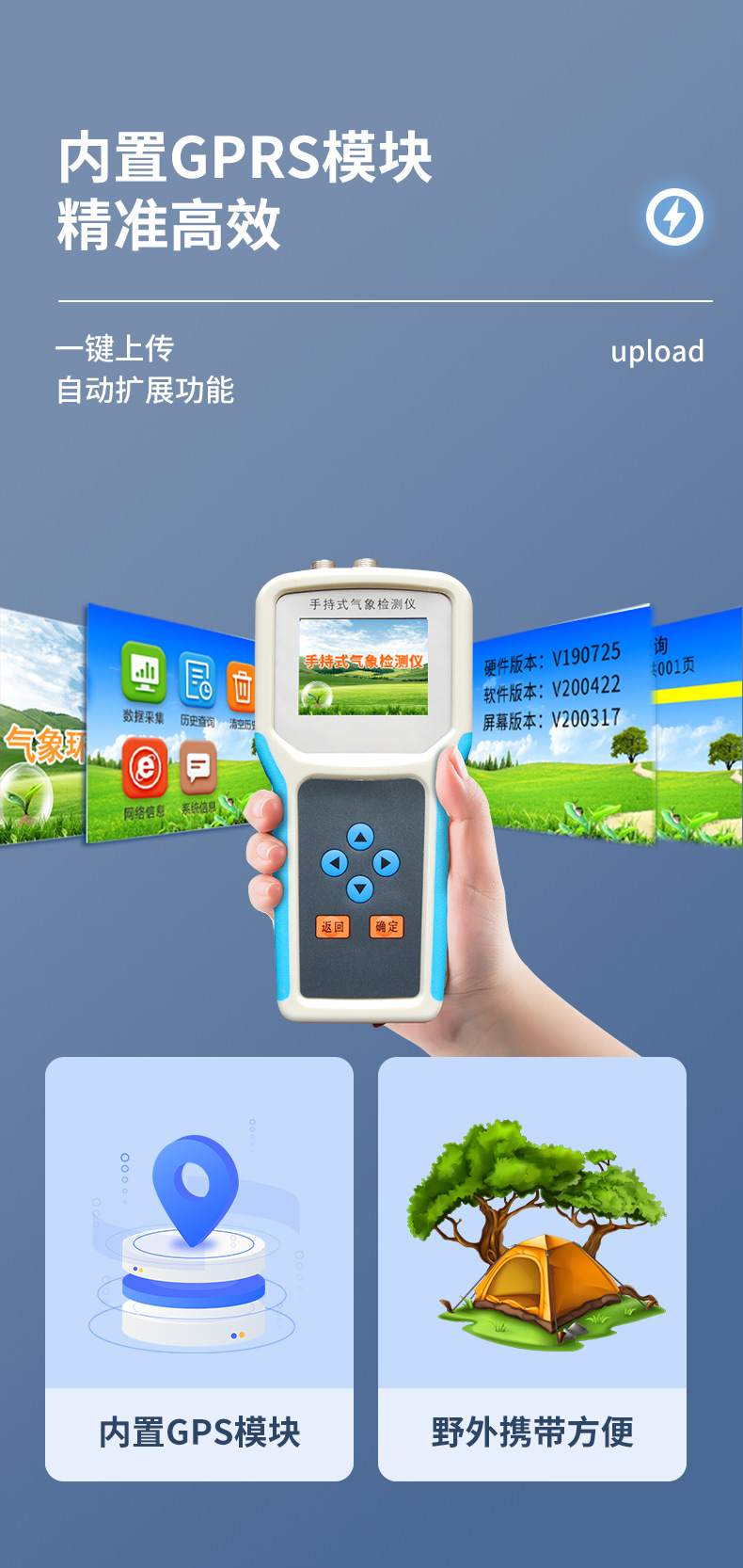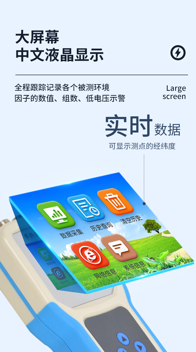 .采用一體化結構設計,內置GPS模塊,GPRS模塊,外置SD卡,能準確的測量出被測地點的地理信息,界面除顯示所測環(huán)境參數(shù)、存儲數(shù)據(jù)外,還可顯示測點的經(jīng)緯度。通過內置的GPRS一鍵上傳被測點的環(huán)境因子測量數(shù)據(jù)等。同時還可以通過外置SD卡直接把數(shù)據(jù)導出到電腦上。(可選)