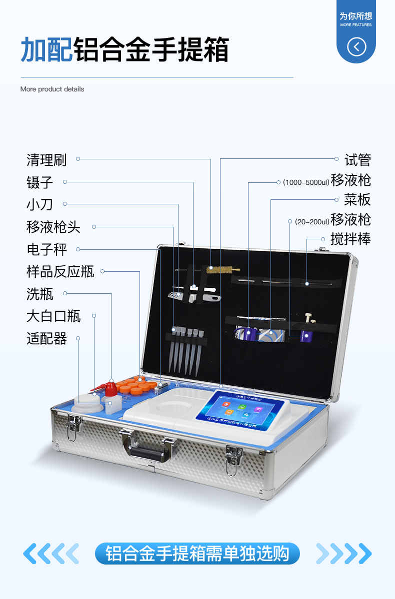 | 安卓智能操作系統,采用更加**和人性化操作,儀器具有網線連接、wifi聯網上傳、GPRS無線遠傳功能,快速上傳數據。 | 智能化程度高,儀器具有自檢功能:具有開機自檢和調零功能,具有自動檢測重復性功能。 | 檢測通道:≥12個檢測通道,可以同時測試多個樣品,每個樣品由程序控制分別獨立工作,不會互相干擾。 | 顯示方式:≥8英寸液晶觸摸屏顯示,人性化中文操作界面,讀數直觀、簡單。 | 配備新一代嵌入式熱敏打印機,可選擇手動打印或者自動打印,檢測完成可自動打印檢測報告和二維碼。 | 光源采用進口超高亮發光二極管,高精度、穩定性強、光源可控、可以關掉不使用的光源,功耗更低。 | 采用USB2.0接口設計,方便數據的存貯和移動,并可隨時與計算機直接相連,并且可用計算機控制儀器。實現數據查詢、瀏覽、分析、統計、打印等。 | 儀器帶有監管平臺。數據可局域網和互聯網數據上傳,檢測結果直接傳至食品安全監管平臺。進行區域食品安全監管及大數據分析處理,檢測區域食品安全長短期動態,達到食品安全問題預估、預警 | 一體化便攜式快檢設備,滿足現場及流動檢測使用需求,能夠在同一軟件下實現所有檢測項目的檢測,并可通過同一窗口直觀顯示檢測結果。 | 儀器具有多品類多種類樣品菜單庫,可靈活選擇檢測樣品,不同的檢測通道可同時檢測不同的樣品項目。也可在儀器上直接編輯錄入樣品名稱、檢測指標、送檢單位等信息并保存進樣品數據庫。 | 樣品處理簡單省力,整體操作快速、安全、便捷。 | 儀器具有自身保護功能,可設置用戶名及密碼,防止非工作人員操作等。 | 高靈敏度,高檢測精度,高重復性精度,掃描式高精度光學傳感器。 | 內置強大的數據庫,可在儀器上直接選擇樣品名稱、檢測指標、送檢單位等信息,也可在儀器上直接編輯錄入樣品名稱、檢測指標、送檢單位等信息并保存進樣品數據庫。 | 儀器具有重新校準、鎖定、恢復出廠設置功能。 | 支持U盤存儲。 結果判定線可修改,對照值標定值可保存,斷電不丟失數據。 |