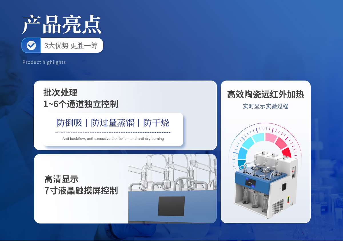 | 1.自動化程度高:內置冷卻水循環機,實現全自動化操作,提高實驗效率與準確性。 | 2.多通道獨立控制:3個加熱單元各自獨立,配備防倒吸、防過量蒸餾及防干燒保護。 | 3.智能觸控:7寸液晶觸摸屏,支持自定義保存*多1000種蒸餾方法,內置18種國標方法。 | 4.精準控制:采用**陶瓷遠紅外加熱,具備時間與重量雙重終點控制,確保蒸餾精度達0.1ml。 | 5.安全可靠:集成自動清洗、自動氣密檢查、反吹等功能,確保設備長期穩定運行。 | 6.操作簡便:一鍵啟動,支持遠程OTA系統升級,滿足不同用戶的使用需求。 |