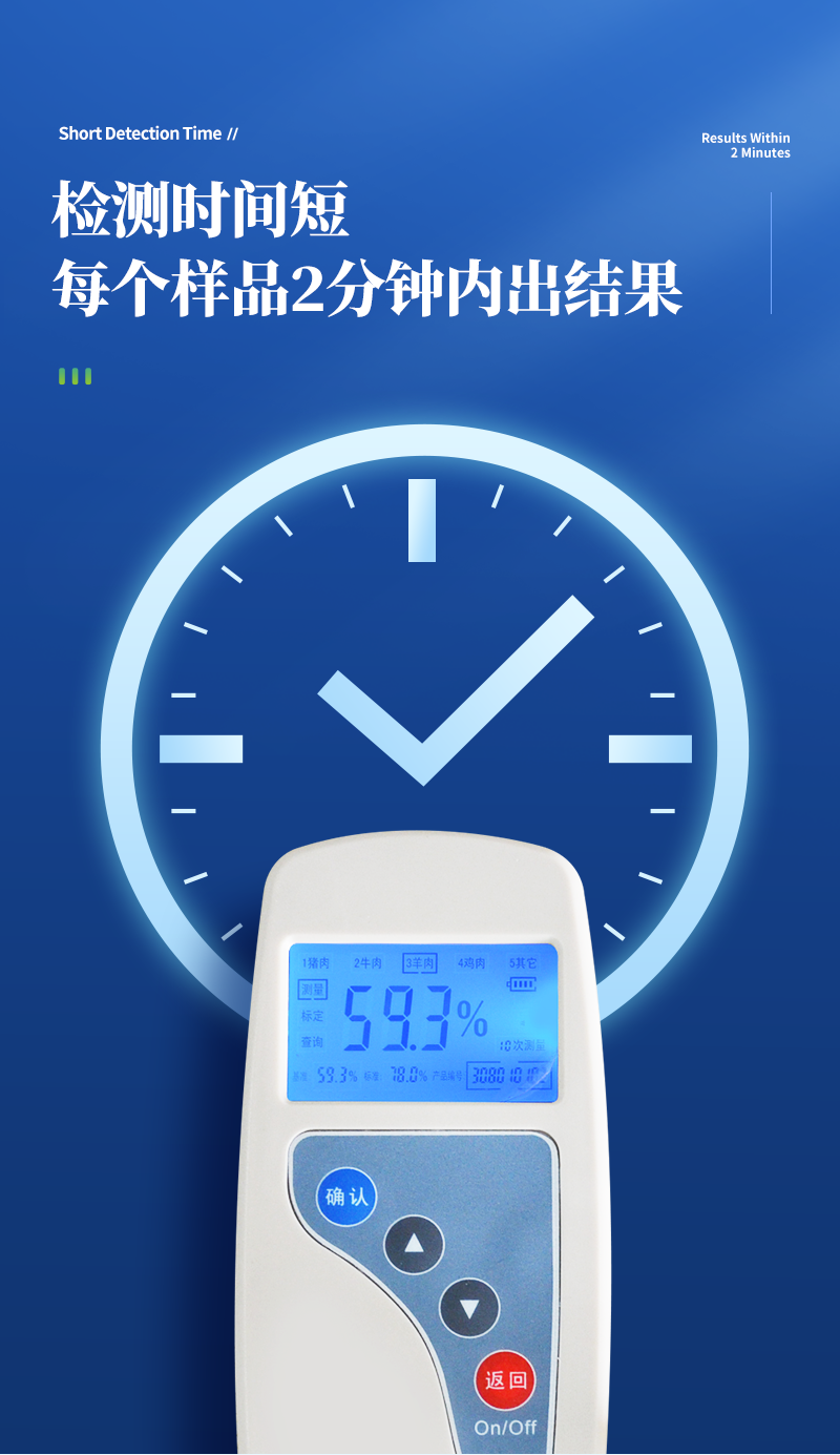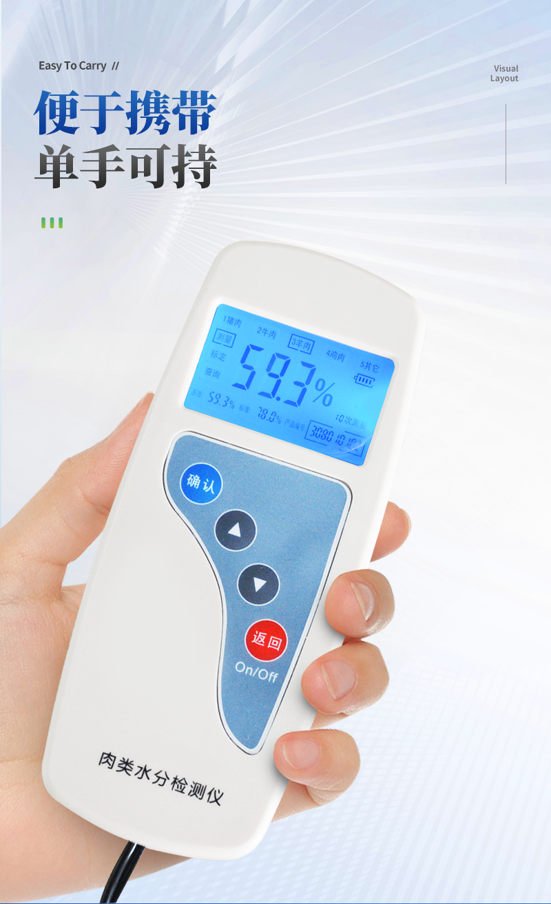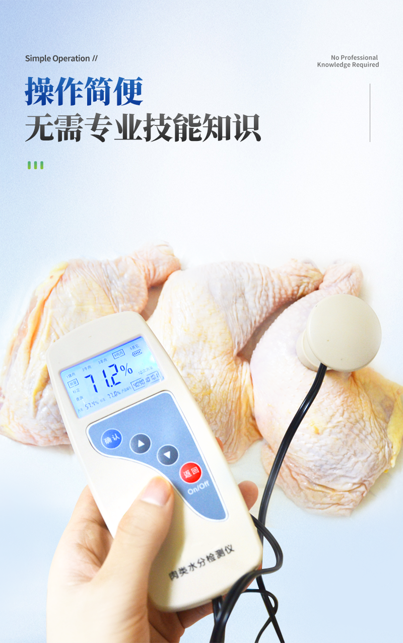 肉類水分檢測儀主要用于快速豬肉、牛肉、雞肉等動物肉類水分含量,從而判斷所測樣品是否為注水肉,該儀器設計精巧,單手可持,儀器可根據測定對象的品種,設定相應的判斷標準值。