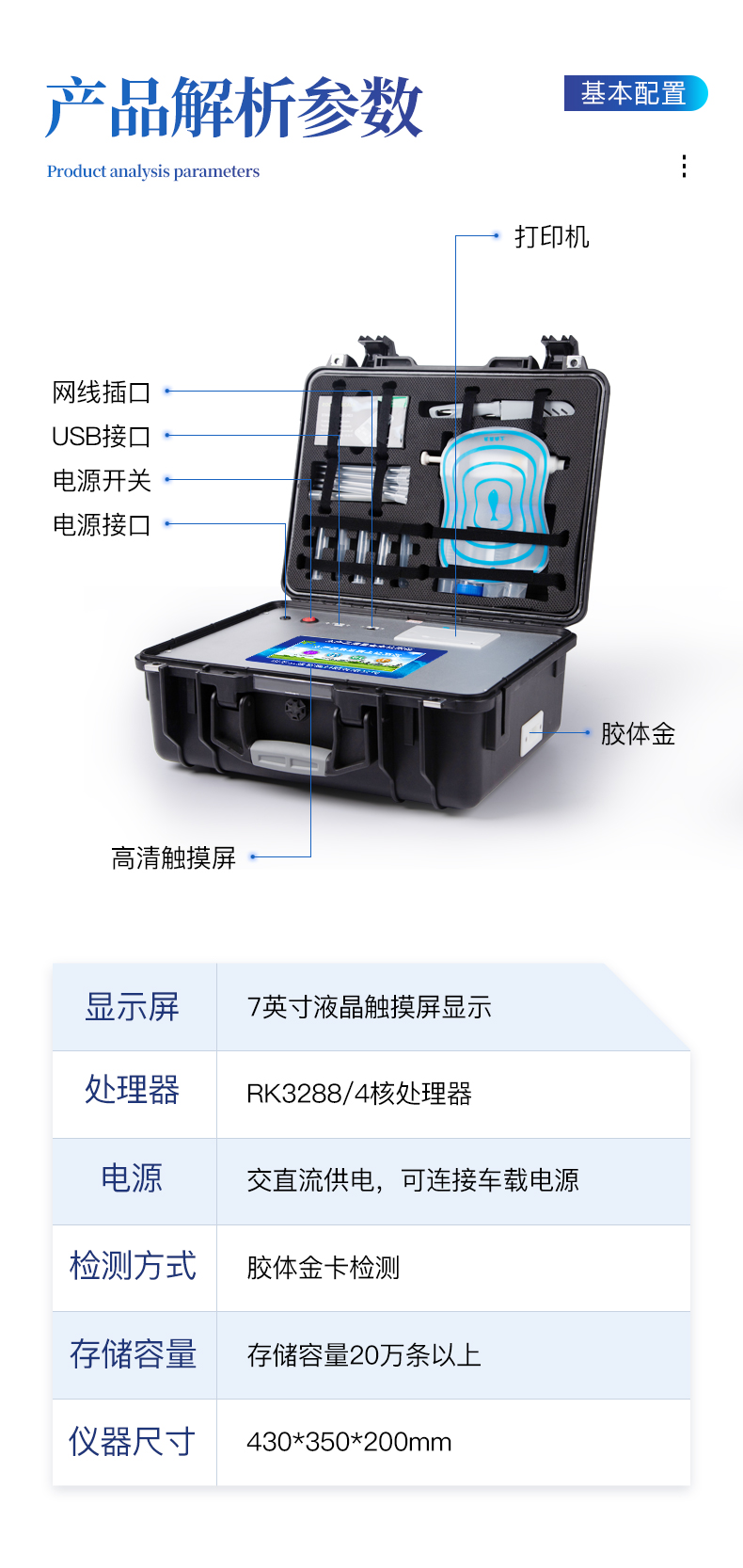 | 1、主控芯片采用ARM Cortex-A7,RK3288/4核處理器,主頻1.88Ghz,運轉速度更快速,穩定性更強。 | 2、顯示方式:7英寸液晶觸摸屏顯示,人性化中文操作界面,讀數直觀、簡單。 | 3、交直流兩用,直流12V供電,可連接車載電源,可配6ah大容量充電鋰電池,方便戶外流動測試。 | 4、光源亮度自動調節與校準 | 5、智能恒流穩壓,光強自動校準,長時間連續工作光源無溫漂現象。。 | 6、內置新國家限量標準,與所測結果進行現場比對,并持續更新標準。 | 7、不間斷進樣,連續檢測 | 8、樣本編號自動累加。 | 9、檢測項目可擴充。 | 10、檢測結果可批量打印,批量上傳。 | 11、檢測結果為Excel表格,連接電腦即可拷貝。 | 12、檢測結果存儲容量20萬條 | 13、支持U盤存儲,標準USB接口,免驅動安裝。 | 14、固件可升級 |