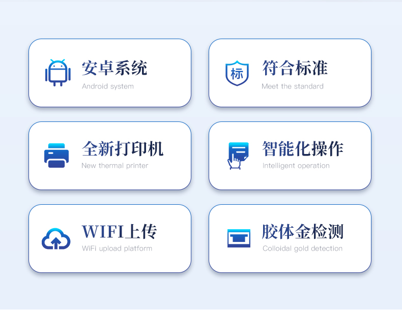 | 1、安卓智能操作系統(tǒng),采用更加**和人性化操作,儀器具有網(wǎng)線連接、wifi聯(lián)網(wǎng)上傳、GPRS無線遠(yuǎn)傳功能,快速上傳數(shù)據(jù)。 | 2、智能化程度高,儀器具有自檢功能:具有開機(jī)自檢和調(diào)零功能,具有自動檢測重復(fù)性功能。 | 3、新一代高速熱敏打印機(jī),檢測完成可自動打印檢測報(bào)告和二維碼。 | 4、儀器帶有監(jiān)管平臺,數(shù)據(jù)可局域網(wǎng)和互聯(lián)網(wǎng)數(shù)據(jù)上傳,檢測結(jié)果直接傳至食品安全監(jiān)管平臺。進(jìn)行區(qū)域食品安全監(jiān)管及大數(shù)據(jù)分析處理與數(shù)據(jù)統(tǒng)計(jì),檢測區(qū)域食品安全長短期動態(tài),達(dá)到食品安全問題預(yù)估、預(yù)警 | 5、一體化主機(jī),包含食品安全檢測模塊、多通道農(nóng)藥殘留檢測模塊、膠體金免疫層析檢測模塊。 | 6、一體化便攜式快檢設(shè)備,滿足現(xiàn)場及流動檢測使用需求,能夠在同一軟件下實(shí)現(xiàn)所有檢測項(xiàng)目的檢測,并可通過同一窗口直觀顯示檢測結(jié)果。 | 7、膠體金模塊檢測方式:軌道式自動傳輸掃描,檢測完成后自動退出檢測卡。 | 8、CT線自動識別,無需手動調(diào)整。 | 9、儀器具有品類多種類樣品菜單庫,可靈活選擇檢測樣品,不同的檢測通道可同時(shí)檢測不同的樣品項(xiàng)目。 | 10、樣品處理簡單省力,整體操作快速、安全、便捷。 | 11、儀器具有自身保護(hù)功能,可設(shè)置用戶名及密碼,防止非工作人員操作等。 | 12、高靈敏度,高檢測精度,高重復(fù)性精度,掃描式高精度光學(xué)傳感器。 | 13、內(nèi)置強(qiáng)大的數(shù)據(jù)庫,可在儀器上直接選擇樣品名稱、檢測指標(biāo)、送檢單位等信息,也可在儀器上直接編輯錄入樣品名稱、檢測指標(biāo)、送檢單位等信息并保存進(jìn)樣品數(shù)據(jù)庫。 | 14、儀器具有重新校準(zhǔn)、鎖定、恢復(fù)出廠設(shè)置功能。 | 15、結(jié)果判定線可修改,對照值標(biāo)定值可保存,斷電不丟失數(shù)據(jù)。 | 16、兼容市場上所有的膠體金卡,使用耗材不受限制,極大增強(qiáng)用戶使用體驗(yàn)。 |