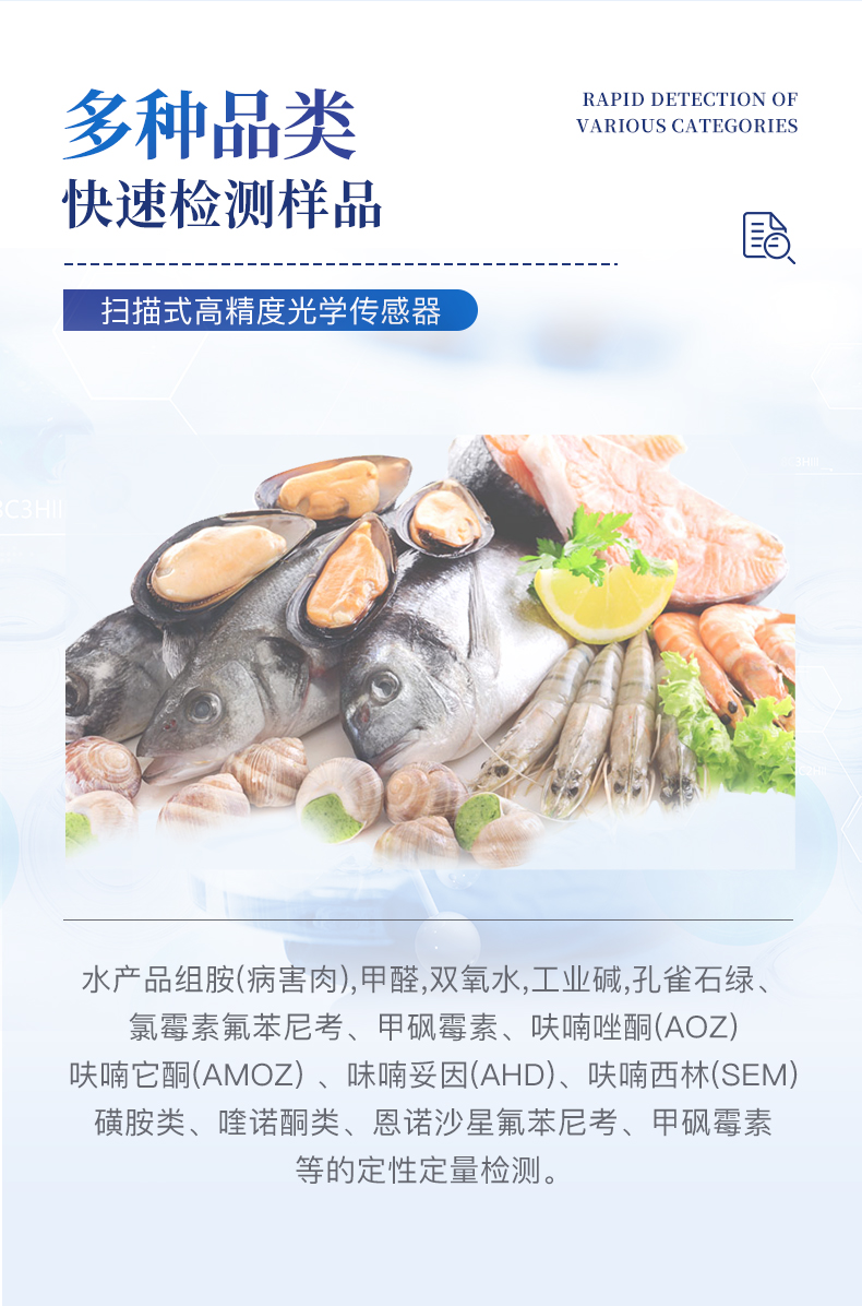 適用于魚、蝦等水產(chǎn)中孔雀石綠、氯霉素、硝基呋喃類:呋喃唑酮(AOZ)、呋喃它酮( AMOZ )、呋喃妥因(AHD)、呋喃西林(SEM)、呋喃那斯、磺胺類、激素類、四環(huán)素類、金霉素、土霉素、甲砜霉素、氟苯尼考、喹諾酮類藥物:噁喹酸、諾氟沙星、恩諾沙星、環(huán)丙沙星、氧氟沙星的定性定量檢測。