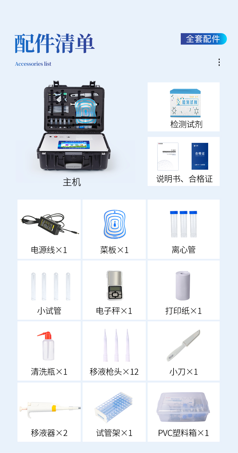 | 主機(jī) 1 臺 | 剪刀 1 把 | 天平 1 個 0.01g | 離心機(jī) 1 臺 就是4000轉(zhuǎn),20ml,6孔 | 氮吹儀 臺 1 水浴12孔 | 移液器 把 1 | 氮?dú)馄浚ㄗ詡洌? 無法快遞 需要自備 自備 | 氯霉素測試卡 盒 1 每盒10次 |