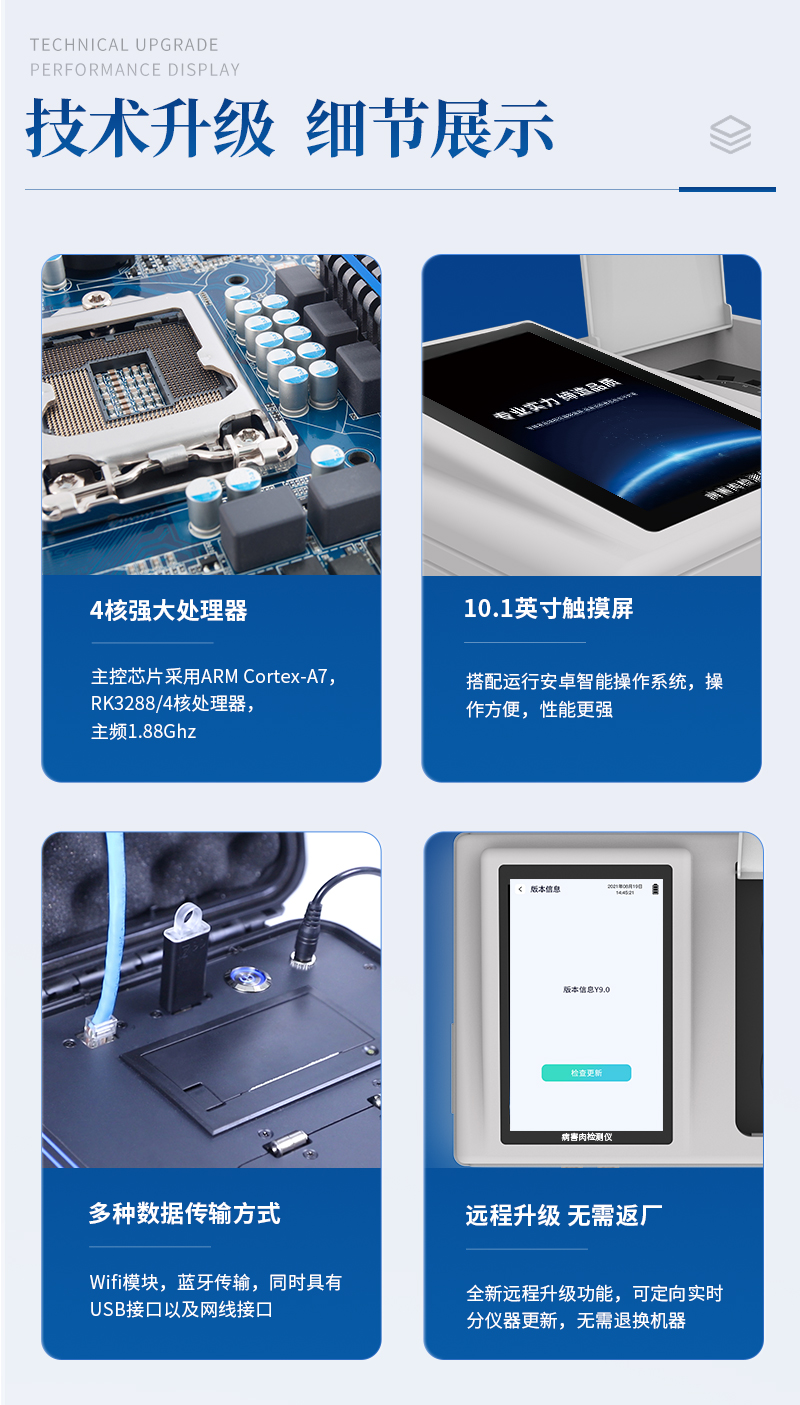 儀器采用臺(tái)式一體化系統(tǒng)檢測(cè)技術(shù),將分光光度模塊、數(shù)字化管理模塊、無線通訊模塊高度集成于一體,可支持檢測(cè)60種食品安全檢測(cè)項(xiàng)目,同時(shí)預(yù)留升級(jí)檢測(cè)方法。儀器檢測(cè)模塊標(biāo)準(zhǔn)化、智能化,檢測(cè)項(xiàng)目可隨意自由組合。檢測(cè)箱體內(nèi)置多個(gè)標(biāo)準(zhǔn)檢測(cè)單元,檢測(cè)模塊可以調(diào)整配置。顯示屏幕:儀器采用10.1英寸豎向液晶觸摸屏顯,搭配運(yùn)行安卓智能操作系統(tǒng),主控芯片采用ARM Cortex-A7,RK3288/4核處理器,主頻1.88Ghz,操作方便,性能更強(qiáng)。檢測(cè)通道:≥12通道;采用精密旋轉(zhuǎn)比色池設(shè)計(jì),使用同芯片同光源校準(zhǔn)精度,解決不同光源之間的誤差值,更加準(zhǔn)確**。(1-12通道間誤差0.1%,**號(hào):**202022821055.2)儀器光源:高精度進(jìn)口四波長冷光源,每個(gè)通道均配置 410、520、590、630nm 波長光源,標(biāo)配**的光路切換裝置,**光路切換功能可實(shí)現(xiàn)64波長,并且所有檢測(cè)項(xiàng)目可實(shí)現(xiàn)所有通道同時(shí)檢測(cè)。設(shè)備可一鍵校準(zhǔn),自動(dòng)保存校準(zhǔn)數(shù)據(jù),自動(dòng)對(duì)比校驗(yàn),得到精準(zhǔn)光源,采用Android SP存儲(chǔ)數(shù)據(jù),光源數(shù)據(jù)永不丟失,方便每一次使用。通訊接口:配備無線通信模塊、4G(APN)通訊模塊、藍(lán)牙傳輸,同時(shí)具有雙USB接口以及RJ45網(wǎng)線接口,可以多方式實(shí)現(xiàn)數(shù)據(jù)保存及數(shù)據(jù)傳輸。存儲(chǔ)方式:支持U盤存儲(chǔ),標(biāo)準(zhǔn)USB接口,免驅(qū)動(dòng)安裝。檢測(cè)結(jié)果存儲(chǔ)容量20萬條以上,可生成Excel表格進(jìn)行拷貝,并具有登錄保護(hù)功能。智能化操作系統(tǒng):1、操作系統(tǒng):儀器可在同一檢測(cè)界面自動(dòng)對(duì)應(yīng)相關(guān)檢測(cè)通道,一次性選擇1-12個(gè)樣品名稱,無需退出界面,節(jié)省操作時(shí)間。并可以對(duì)每個(gè)通道屬性和樣品信息單獨(dú)進(jìn)行編輯,例如送檢單位、人員,檢測(cè)人員等,打印時(shí)勾選打印顯示。2、數(shù)據(jù)集成系統(tǒng):設(shè)備首頁自動(dòng)匯總分析檢測(cè)數(shù)據(jù),包含:周檢測(cè)數(shù)據(jù)、月檢測(cè)數(shù)據(jù),全部檢測(cè)總數(shù)量,均包含檢測(cè)總數(shù),合格數(shù),不合格數(shù),以及相關(guān)柱形分析圖,各項(xiàng)檢測(cè)數(shù)據(jù)一目了然,無需電腦查詢,更加快捷直觀。3、數(shù)據(jù)庫系統(tǒng):十幾項(xiàng)數(shù)據(jù)庫分類管理儀器:包含項(xiàng)目類型、項(xiàng)目數(shù)據(jù)、檢測(cè)數(shù)據(jù)、歷史記錄、國標(biāo)信息、曲線信息、采樣信息、檢測(cè)信息、受檢信息、復(fù)核信息、圖表信息、光源校準(zhǔn)信息、打印樣式信息、樣品庫信息等等,數(shù)據(jù)庫之間互相協(xié)調(diào)聯(lián)動(dòng)保證數(shù)據(jù)的真實(shí)完整性。同時(shí)產(chǎn)品數(shù)據(jù)庫以及歷史檢測(cè)記錄支持一鍵檢索功能。4、限量規(guī)判系統(tǒng):具有限量查詢、添加物質(zhì)合規(guī)判定系統(tǒng)。檢測(cè)出結(jié)果后,系統(tǒng)自動(dòng)調(diào)用系統(tǒng)數(shù)據(jù)庫中相關(guān)國標(biāo)進(jìn)行比對(duì)判定,客觀顯示判定結(jié)果是否合格。5、項(xiàng)目預(yù)設(shè)系統(tǒng):儀器具有任務(wù)預(yù)設(shè)模塊,一鍵提前預(yù)設(shè),給出方便快捷的新檢測(cè)方案,每一個(gè)任務(wù)分別可以設(shè)置不同的樣品、批次、編號(hào)、來源、備注、抽樣信息、檢測(cè)信息、受檢信息、復(fù)核信息等更多信息。樣品送檢時(shí)一鍵調(diào)取保存信息,并可多次調(diào)取,大大提高檢測(cè)效率。6、數(shù)據(jù)監(jiān)管系統(tǒng):同步對(duì)接監(jiān)管平臺(tái),數(shù)據(jù)可局域網(wǎng)和互聯(lián)網(wǎng)數(shù)據(jù)上傳,檢測(cè)結(jié)果可選擇直接傳至食品安全監(jiān)管平臺(tái)。進(jìn)行區(qū)域食品安全監(jiān)管及大數(shù)據(jù)分析處理與數(shù)據(jù)統(tǒng)計(jì),檢測(cè)區(qū)域食品安全長短期動(dòng)態(tài),達(dá)到食品安全問題預(yù)估、預(yù)警。7.1、全新打印系統(tǒng):內(nèi)置全新打印機(jī),新創(chuàng)自定義打印方式,可按需靈活勾選控制:二維碼,抽樣信息、檢測(cè)信息,受檢信息、復(fù)核信息、抽樣日期、檢測(cè)日期等信息的打印。7.2、A4紙版本報(bào)告打印功能(可選配):設(shè)備擁有兩種結(jié)果展示方式,可以自動(dòng)生成A4打印模板和小票打印模板兩種樣式,可通過WiFi及網(wǎng)線等方式鏈接外置打印機(jī)可進(jìn)行打印。供電模式:儀器交直流兩用,直流12V供電,可連接車載電源,可配6ah大容量充電鋰電池,電量可實(shí)時(shí)顯示,方便戶外流動(dòng)測(cè)試。儀器具備遠(yuǎn)程升級(jí)功能,可定向分客戶分儀器更新,開機(jī)后自動(dòng)更新,并可持續(xù)性免費(fèi)更新系統(tǒng)版本,無需像傳統(tǒng)產(chǎn)品返廠更新,節(jié)省時(shí)間及人力成本并避免了物流運(yùn)輸返廠升級(jí)導(dǎo)致設(shè)備損壞的潛在風(fēng)險(xiǎn)。
