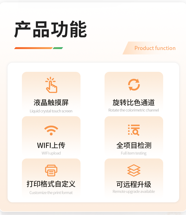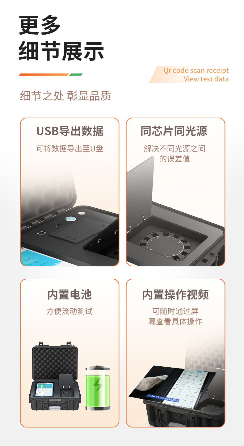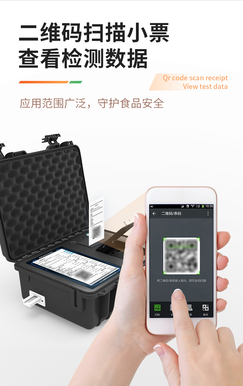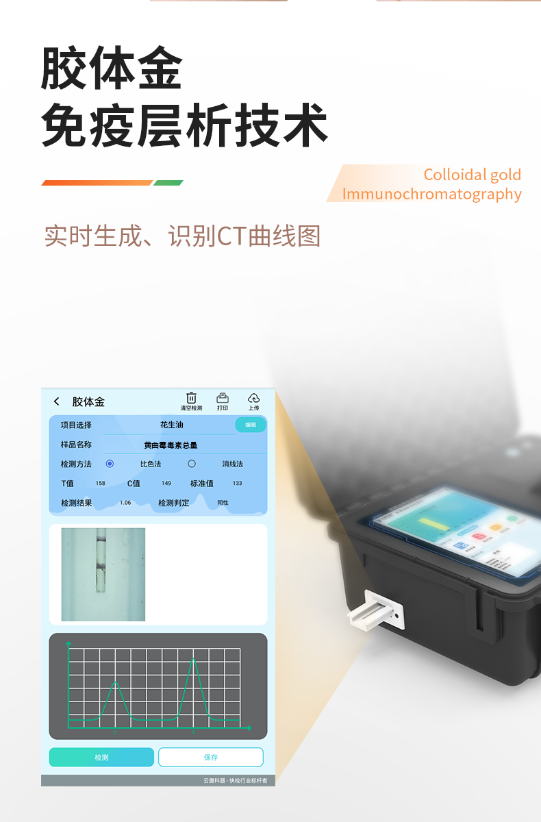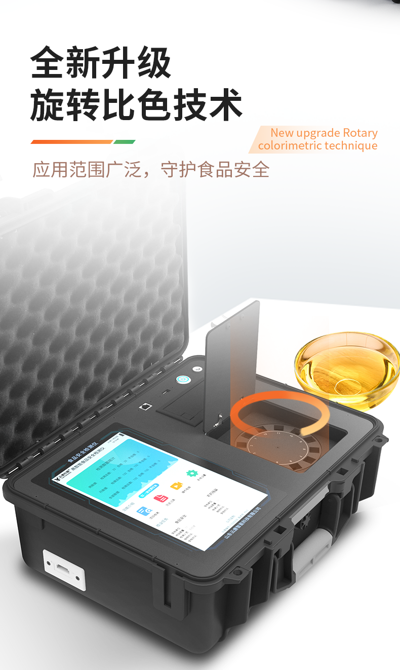 | 1、儀器采用手提一體化系統(tǒng)檢測技術,將分光光度模塊、膠體金檢測模塊、新型農殘檢測模塊、數字化管理模塊、無線通訊模塊高度集成于一體,支持檢測200種食品安全檢測項目,同時預留升級檢測方法。 | 2、儀器檢測模塊標準化、智能化,檢測項目可隨意自由組合。檢測箱體內置多個標準檢測單元,檢測模塊可以調整配置。 | 3、顯示屏幕:儀器采用10.1英寸豎向液晶觸摸屏顯,搭配運行安卓智能操作系統(tǒng),主控芯片采用ARM Cortex-A7,RK3288/4核處理器,主頻1.88Ghz,操作方便,性能更強。 | 4、檢測通道:≥12通道;采用精密旋轉比色池設計,使用同芯片同光源校準精度,解決不同光源之間的誤差值,更加準確**。(1-12通道間誤差0.1%,**號:**202022821055.2) | 5、儀器光源:高精度進口四波長冷光源,每個通道均配置 410、520、590、630nm 波長光源,標配**的光路切換裝置,**光路切換功能可實現(xiàn)64波長,并且所有檢測項目可實現(xiàn)所有通道同時檢測。 | 6、設備可一鍵校準,自動保存校準數據,自動對比校驗,得到精準光源,采用Android SP存儲數據,光源數據永不丟失,方便每一次使用。 | 7、通訊接口:配備無線通信模塊、4G(APN)通訊模塊、藍牙傳輸,同時具有雙USB接口以及RJ45網線接口,可以多方式實現(xiàn)數據保存及數據傳輸。 | 8、存儲方式:支持U盤存儲,標準USB接口,免驅動安裝。檢測結果存儲容量20萬條以上,可生成Excel表格進行拷貝,并具有登錄保護功能。 | 9、智能化操作系統(tǒng): | 9.1、操作系統(tǒng):儀器可在同一檢測界面自動對應相關檢測通道,一次性選擇1-12個樣品名稱,無需退出界面,節(jié)省操作時間。并可以對每個通道屬性和樣品信息單獨進行編輯,例如送檢單位、人員,檢測人員等,打印時勾選打印顯示。 | 9.2、數據集成系統(tǒng):設備首頁自動匯總分析檢測數據,包含:周檢測數據、月檢測數據,全部檢測總數量,包含檢測總數,合格數,不合格數,以及相關柱形分析圖,各項檢測數據一目了然,無需電腦查詢,更加快捷直觀。 | 9.3、數據庫系統(tǒng):十幾項數據庫分類管理儀器:包含項目類型、項目數據、檢測數據、歷史記錄、國標信息、曲線信息、采樣信息、檢測信息、受檢信息、復核信息、圖表信息、光源校準信息、打印樣式信息、樣品庫信息等等,數據庫之間互相協(xié)調聯(lián)動保證數據的真實完整性。同時產品數據庫以及歷史檢測記錄支持一鍵檢索功能。 | 9.4、限量規(guī)判系統(tǒng):具有限量查詢、添加物質合規(guī)判定系統(tǒng)。檢測出結果后,系統(tǒng)自動調用系統(tǒng)數據庫中相關國標進行比對判定,客觀顯示判定結果是否合格。 | 9.5、項目預設系統(tǒng):儀器具有任務預設模塊,一鍵提前預設,給出方便快捷的新檢測方案,每一個任務分別可以設置不同的樣品、批次、編號、來源、備注、抽樣信息、檢測信息、受檢信息、復核信息等更多信息。樣品送檢時一鍵調取保存信息,并可多次調取,大大提高檢測效率。 | 9.6、數據監(jiān)管系統(tǒng):同步對接監(jiān)管平臺,數據可局域網和互聯(lián)網數據上傳,檢測結果可直接傳至食品安全監(jiān)管平臺。進行區(qū)域食品安全監(jiān)管及大數據分析處理與數據統(tǒng)計,監(jiān)測區(qū)域食品安全長短期動態(tài)及問題預估、預警。 | 9.7.1、全新打印系統(tǒng):內置全新打印機,新創(chuàng)自定義打印方式,可按需靈活勾選控制:產品合格證(國家農業(yè)部標準要求),二維碼,抽樣信息、檢測信息,受檢信息、復核信息、抽樣日期、檢測日期等信息的打印。 | 9.7.2、A4紙版本報告打印功能(可選配):設備擁有兩種結果展示方式,可以自動生成A4打印模板和小票打印模板兩種樣式,可通過WiFi及網線等方式鏈接外置打印機可進行打印。 | 10、供電模式:儀器交直流兩用,直流12V供電,可連接車載電源,配6ah大容量充電鋰電池,電量可實時顯示,方便戶外流動測試。 | 11、膠體金檢測模塊:采用單通道CMOS成像處理技術及膠體金免疫層析技術,可讀取膠體金卡數據,自動采集、處理分析,將檢測結果顯示,并可根據參考限值自動判斷檢測結果,可檢測常見的獸藥殘留、生物毒素、抗生素、違禁添加物等。 | 11.1、探測技術:CMOS成像探測; | 11.2、檢測通道:1個通道; | 11.3、檢測方式:消線法和比色法; | 11.4、顯示模式:陰性或陽性; | 11.5、曲線形式:軌道式掃描方式,顯示金標卡圖像,實時生成、識別CT曲線圖,無需手動調整,完成檢測后自動退出檢測卡。兼容市場上其他金標卡,使用耗材不受限制。 | 12、儀器具備遠程升級功能,可定向分客戶分儀器更新,開機后自動更新,并可持續(xù)性免費更新系統(tǒng)版本,無需像傳統(tǒng)產品返廠更新,節(jié)省時間及人力成本并避免了物流運輸返廠升級導致設備損壞的潛在風險。 |
