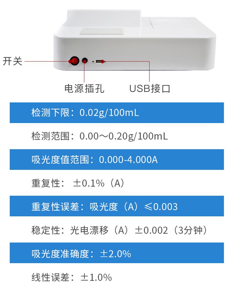 1、儀器采用臺式一體化系統(tǒng)檢測技術(shù),將分光光度模塊、數(shù)字化管理模塊、無線通訊模塊高度集成于一體,支持檢測200種食品安全檢測項(xiàng)目,同時預(yù)留升級檢測方法。