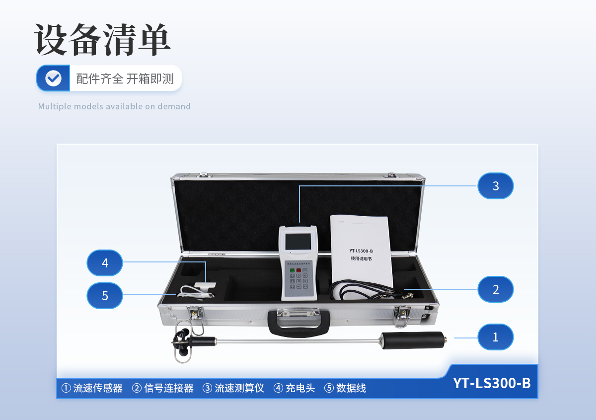 | ①流速傳感器、②信號連接器、③流速測算儀、④充電頭、⑤數(shù)據(jù)線 |