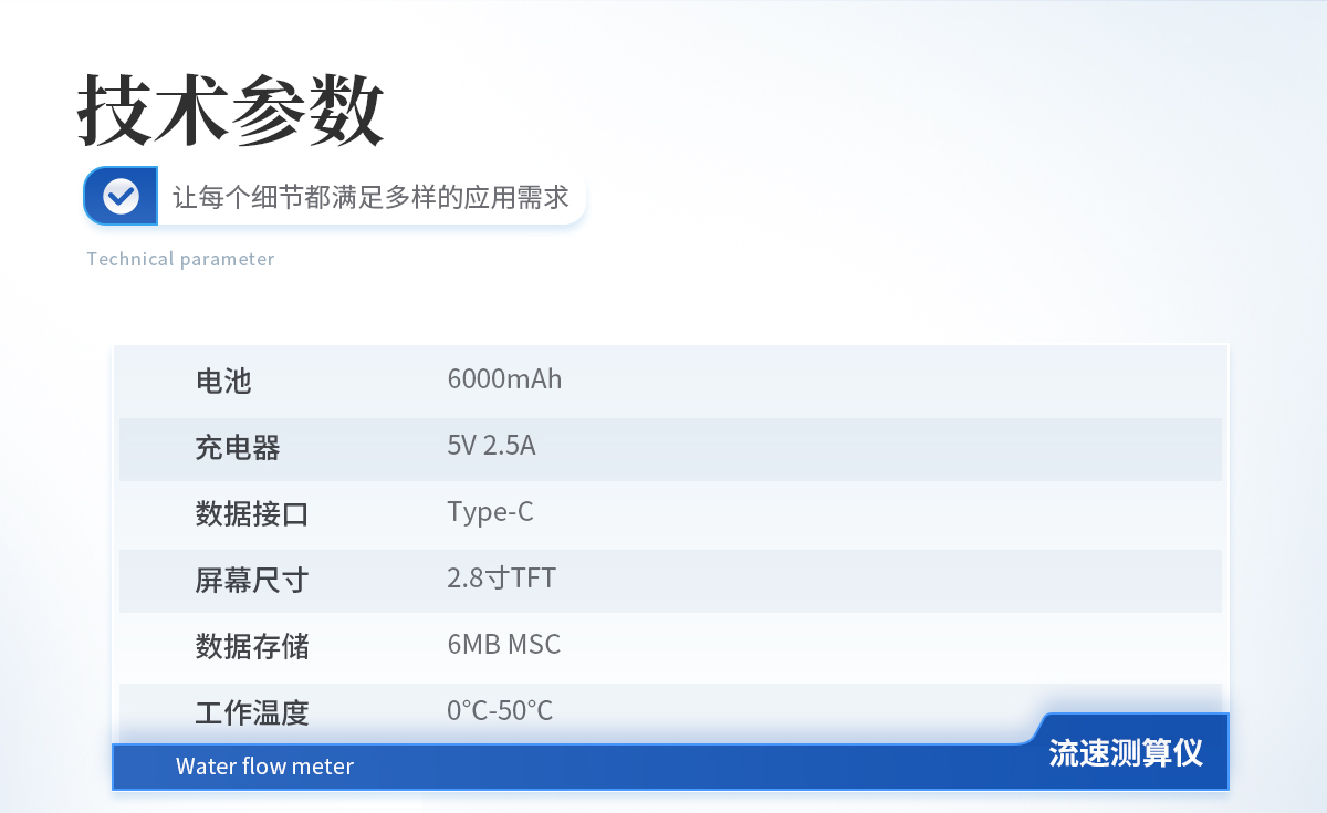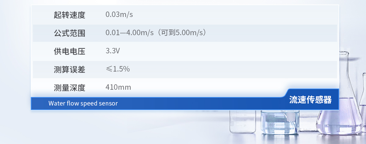 | 起轉(zhuǎn)速度 :0.03m/s | 公式范圍 :0.01—4.00m/s(可到5.00m/s) | 供電電壓:3.3V | 測算誤差 :≤1.5% | 測量深度 :410mm |