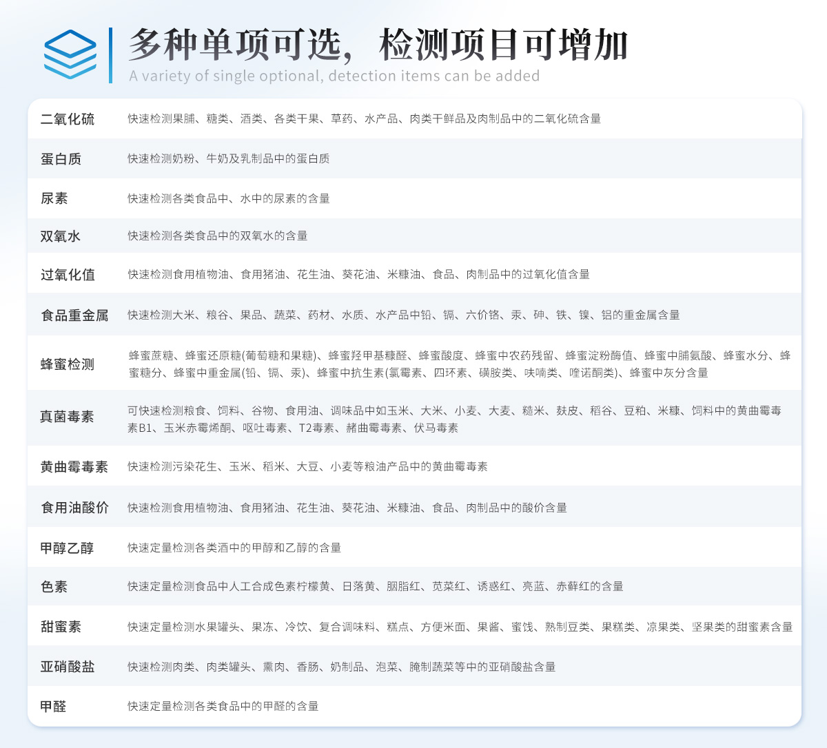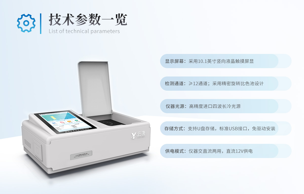 | 儀器采用臺式一體化系統檢測技術,將分光光度模塊、新型農殘檢測模塊、數字化管理模塊、無線通訊模塊高度集成于一體,支持檢測200種食品安全檢測項目,同時預留升級檢測方法。 | 儀器檢測模塊標準化、智能化,可隨意自由組合。檢測箱體內置多個標準檢測單元,檢測模塊可以調整配置。 | 儀器采用全新安卓智能系統,主控芯片采用 ARM Cortex-A7,RK3288/4核處理器,10.1寸高清液晶觸摸豎屏,更加**的UI交互界面,運轉快捷;儀器配備無線通信模塊: 4G(APN)通訊模塊、Wifi模塊,藍牙傳輸,同時具有雙USB接口以及RJ45接口能以多種方式實現數據保存和數據傳輸功能。 | 創新檢測模式: | ★檢測通道:≥12通道;采用精密旋轉比色池設計,使用同芯片同光源校準精度,解決不同光源之間的誤差值。1-12通道間誤差0.1%。(**號:**202022821055.2) | ★儀器具有自動識別比色皿檢測功能,即:將樣品比色皿放入儀器后,點擊樣品檢測,儀器自動識別比色皿進行通道檢測。 | 進口高精光源: | 高精度進口四波長冷光源,通道配置 410、520、590、630nm 波長光源,一個光源芯片驅動一個光源,誤差極小,每臺設備單獨**校準光源,**比對,同時參照四種不同波段光源全方位覆蓋市面上99%的農殘食品項目檢測。 | 智能化操作系統: | 便捷操作系統:設備檢測時可在同一檢測界面自動對應相關檢測通道一次性選擇1-12個樣品名稱,無須退出界面,節省操作時間。 | 數據集成系統:設備首頁自動統計檢測數據包含:周檢測數據、月檢測數據,全部檢測總數量,均包含檢測總數,合格數,不合格數,以及相關柱形分析圖,對各項檢測數據清晰掌握,無需電腦查詢,更加快捷直觀。 | 項目預設系統:支持添加單個及多個相同或不相同的任務預設,一鍵快速調取,每一個任務分別可以設置不同的樣品、批次、編號、來源、備注、抽樣信息、檢測信息、受檢信息、復核信息等更多信息。無縫鏈接平臺和APP實時查看下發任務。 | 數據監管系統:同步對接監管平臺,數據可局域網和互聯網數據上傳,檢測結果可選擇直接傳至食品安全監管平臺。集成OSS輸出存儲服務、區分設備定向管理應用,進行區域食品安全監管及大數據分析處理與數據統計,檢測區域食品安全長短期動態,達到食品安全問題預估、預警。 | 自定義打印系統:內置全新打印系統,新創自定義打印方式,可按需靈活設置開啟或關閉:產品合格證(國家農業部標準要求),二維碼,抽樣信息、檢測信息,受檢信息、復核信息、抽樣日期、檢測日期等信息的打印。 | 系統遠程更新功能:可定向分客戶分儀器更新系統,按照不同客戶后期實際需求添加項目,無需機器返廠,即可遠程實時升級全新系統,節省時間成本及避免運輸造成設備損壞。 | 儀器主機采用一體化防水、抗壓、防撞擊、防腐蝕箱體設計,同時配備交直流供電,可連接車載電源,可選配大容量充電鋰電池,滿足現場野外檢測需求。 | 安全證書,放心保障:儀器具有中國計量科學研究院校準證書,權威認證。 |