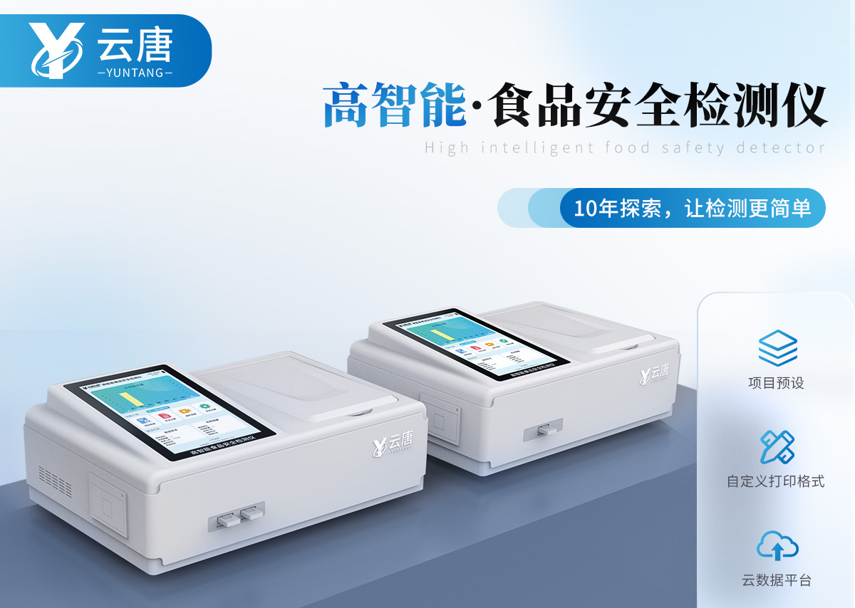 山東云唐智能科技有限公司生產的高智能食品安全檢測儀為集成化食品安全快速檢測分析設備,采用臺式一體化設計,可快速檢測200多種食品安全項目,包含非食用化學物質、濫用食品添加劑、農藥殘留、獸藥殘留、重金屬、病害肉、營養強化劑、抗生素類殘留、激素類殘留、真菌毒素類殘留、化學類殘留等項目的定性定量檢測。目前廣泛應用于市場監管局、檢測中心、衛生監督部門、農業部門、院校及各單位食堂、食品肉產品深加工企業、商超市場、司法部門、餐飲機構、養殖場、屠宰場、檢驗檢疫部門等單位。
