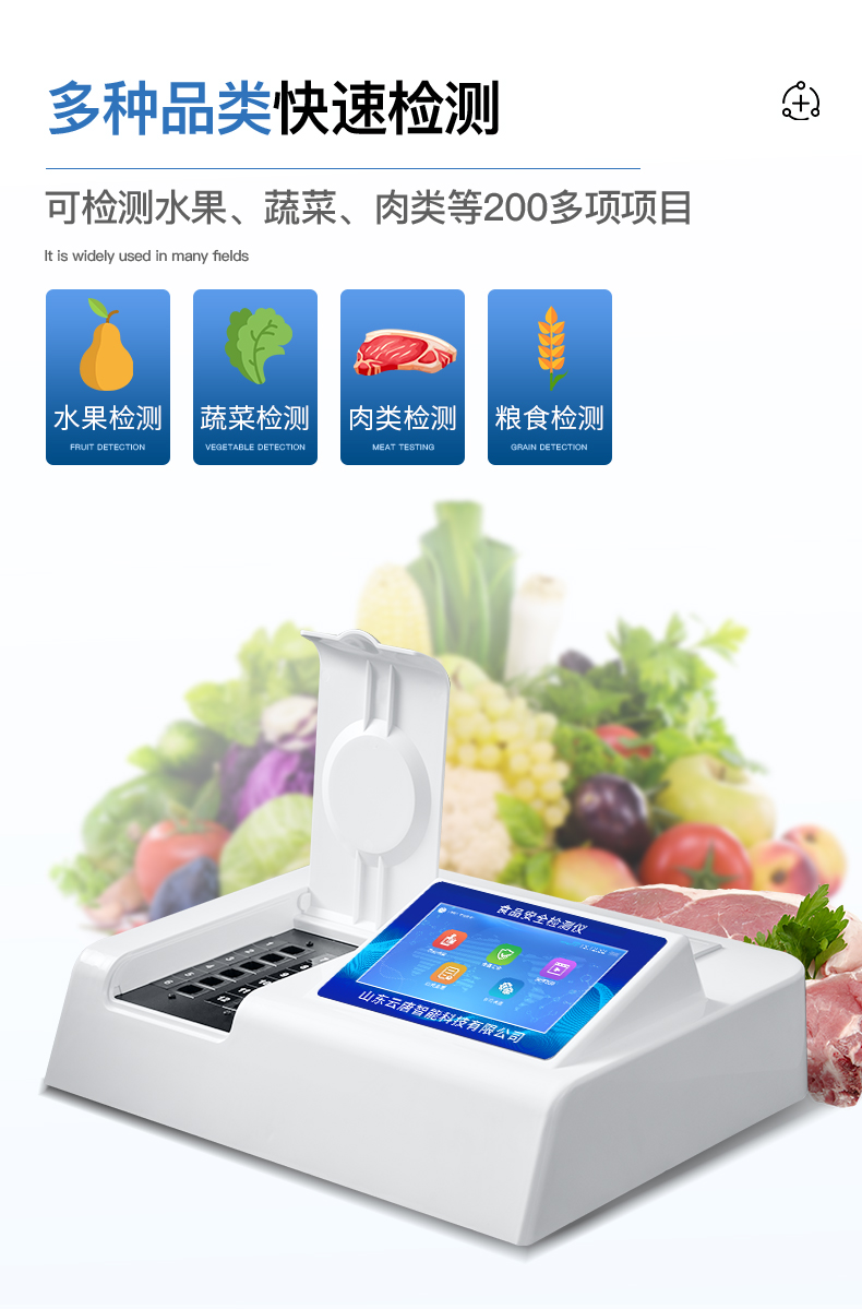 可快速檢測各類食品中的亞硝酸鹽、二氧化硫、甲醛、吊白塊、雙氧水、硼砂、農藥殘留、乳及乳制品中蛋白質、硝酸鹽、重金屬鉛的含量,儀器預留其他項目檢測程序和端口,根據日后需求可方便的自主增加檢測項目。