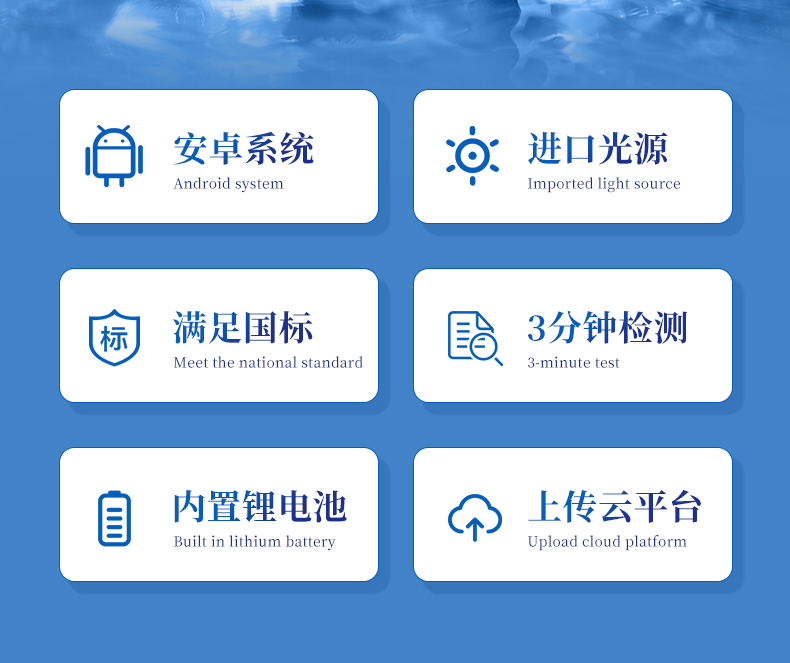 | Android智能系統(tǒng),操作交互性體驗(yàn)更好,更佳簡(jiǎn)便快捷; | 3.5寸高清晰度觸控屏幕,數(shù)據(jù)更直觀 | 配置監(jiān)管平臺(tái),檢測(cè)結(jié)果可直接無(wú)線傳至平臺(tái),進(jìn)行水質(zhì)長(zhǎng)短期分析,輔助管理。 | 內(nèi)置操作流程、操作簡(jiǎn)單、無(wú)需培訓(xùn)、直接上手; | 檢測(cè)速度更快,現(xiàn)場(chǎng)讀取數(shù)據(jù); | 便攜式體積小,重量輕,方便戶外檢測(cè); | 外形小巧美觀,工作穩(wěn)定免維護(hù),具有較好的性價(jià)比; | 采用進(jìn)口冷光源,光學(xué)性能穩(wěn)定,壽命長(zhǎng)達(dá)10萬(wàn)小時(shí); | 交直流兩用,內(nèi)置充電鋰電池,環(huán)保耐用可支持連續(xù)室內(nèi)外工作。 |
